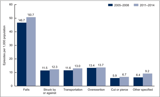 - No significant changes were seen in injury rates from 2005–2008 to 2011–2014 for falls; being struck by or hitting against an object or person; injuries resulting from land, water, or air transportation; overexertion; cutting or piercing by sharp objects; and other specified injury causes (poisoning, fire and burn, animal and insect bites, and accidents from use of machinery).