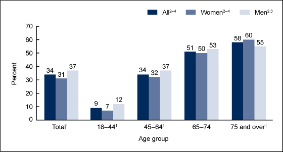 - The percentage of all visits made by men with hypertension also increased with age. But unlike women, visits made by men aged 75 and over (55%) were not significantly higher than visits made by men aged 65–74 (53%).
