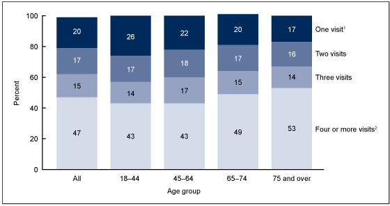 - Almost one-half of all visits by adults with hypertension (47%) were made by those who had an office visit to a sampled doctor four or more times in the past 12 months. This percentage increased with age, ranging from 43% for those aged 18–44 to 53% for those aged 75 and over.