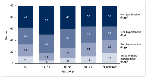 - The percentage of visits made by adults with hypertension receiving three or more hypertensive medications increased with age, from 5% for those aged 18–44 to 18% for those aged 75 and over.