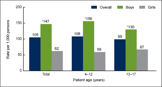 - The visit rate for ADHD was higher for boys than for girls among children aged 4–17 years (147 per 1,000 boys compared with 62 per 1,000 girls).The difference was observed within both age groups evaluated: for children aged 4–12 years (156 per 1,000 boys compared with 59 per 1,000 girls) and for children aged 13–17 years (130 per 1,000 boys compared with 67 per 1,000 girls).