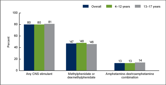 - CNS stimulant medications were mentioned (i.e., provided, prescribed, or continued) at 80% of ADHD visits by children aged 4–12 years and 81% of ADHD visits by children aged 13–17 years (Figure 2).