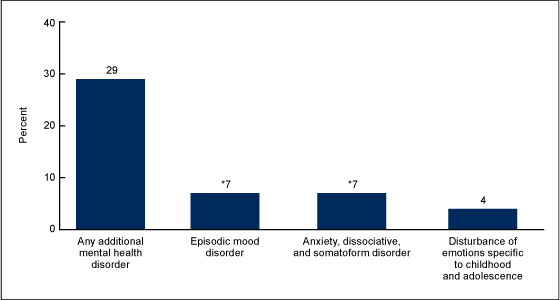 - Additional mental health disorders included episodic mood disorder (7%); anxiety, dissociative, and somatoform disorder (7%); and disturbance of emotions specific to childhood and adolescence (4%).