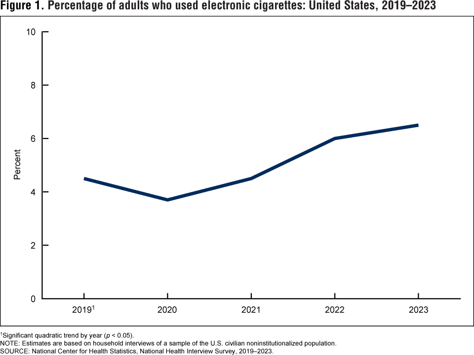 Vahratian A, Briones EM, Jamal A, Marynak KL. Electronic cigarette use among adults in the United States, 2019–2023. NCHS Data Brief, no 524. Hyattsville, MD: National Center for Health Statistics. 2025. DOI: https://dx.doi.org/10.15620/cdc/174583.