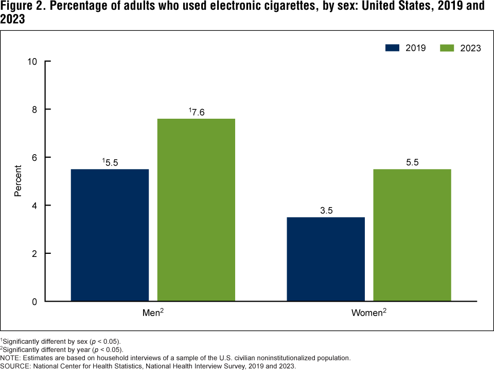 Electronic cigarettes, also known as e-cigarettes or vapes, are the most commonly used tobacco product among youth in the United States (1). Data from the 2024 National Youth Tobacco Survey showed that 5.9% of middle and high school students used electronic cigarettes in the past 30 days, a decline from 7.7% in 2023 (1). While cigarettes remain the most commonly used tobacco product among adults (2), recent trends indicate that electronic cigarette use is increasing among adults (3). This report uses data from the 2019–2023 National Health Interview Survey (NHIS) to present 5-year trends in electronic cigarette use among adults and to show how prevalence estimates changed between 2019 and 2023 for men and women and by age and race and ethnicity.