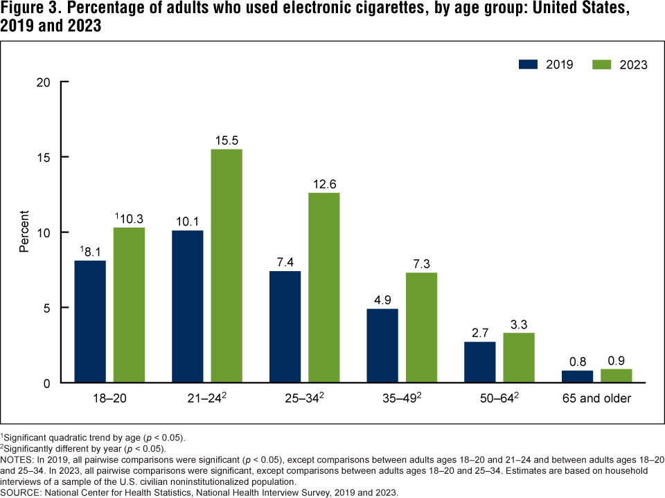 In 2019, electronic cigarette use among adults ages 18–20 (8.1%), 21–24 (10.1%), and 25–34 (7.4%) was not significantly different; use decreased with increasing age among those 35 and older. In 2023, adults ages 21–24 (15.5%) were more likely than adults ages 18–20 (10.3%) to use electronic cigarettes. Use decreased with increasing age among those 25 and older.