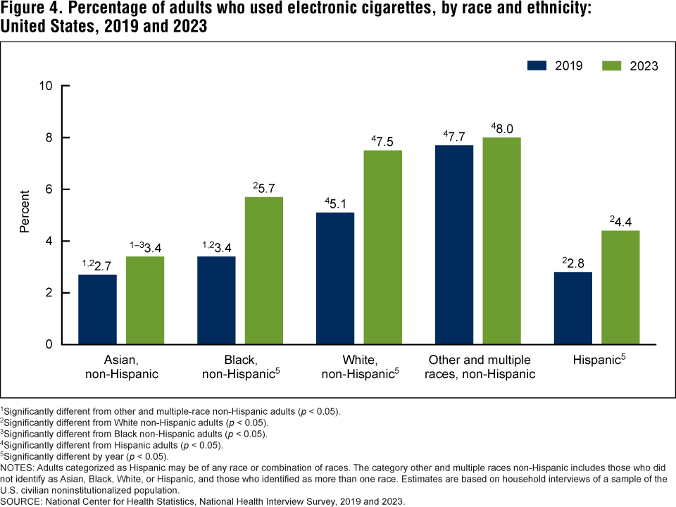 In 2023, other and multiple-race adults (8.0%) remained significantly more likely than Asian adults (3.4%) and Hispanic adults (4.4%) to use electronic cigarettes, and White adults (7.5%) remained significantly more likely than Hispanic, Black, and Asian adults to use electronic cigarettes.