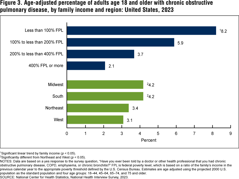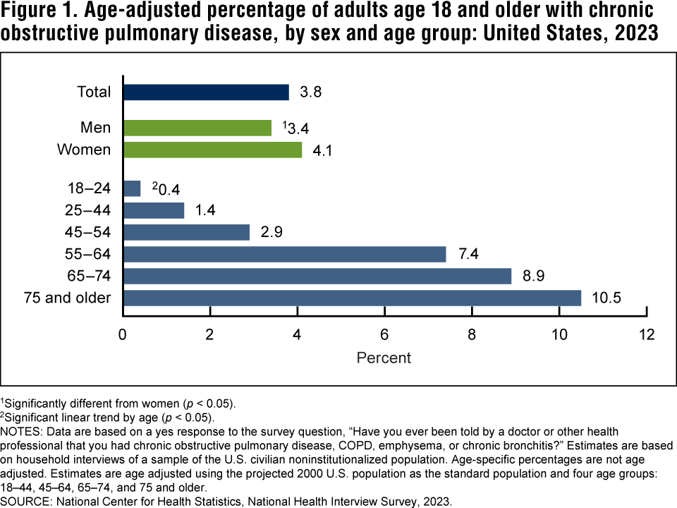 This report describes national estimates of diagnosed COPD in adults age 18 and older by selected sociodemographic characteristics using data from NHIS. In 2023, the age-adjusted prevalence of COPD in adults was 3.8%. Women were more likely than men to have COPD, and prevalence increased with increasing age. Asian adults were less likely than adults of all other racial and ethnic groups to have COPD. The prevalence of COPD decreased with increasing family income and varied by region. Additionally, adults with fair or poor health were more than five times as likely to have COPD than adults with good or better health. COPD prevalence increased with increasing level of functional difficulties. COPD is a major cause of disability and one of the leading causes of death in the United States (3).