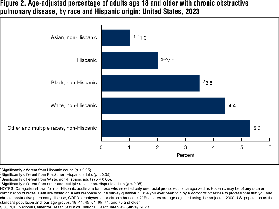 Asian non-Hispanic (subsequently, Asian) adults were less likely to have COPD (1.0%) than adults who are Hispanic (2.0%), Black non-Hispanic (subsequently, Black) (3.5%), White non-Hispanic (subsequently, White) (4.4%), and other and multiple races non-Hispanic (subsequently, other and multiple races) (5.3%) (Figure 2, Table 2).