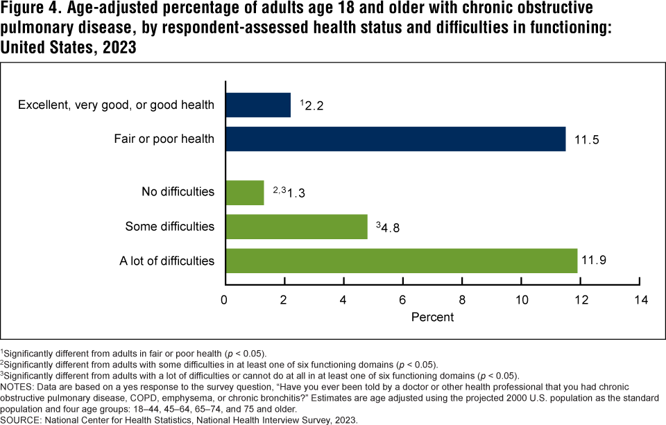- Adults with fair or poor health were about five times as likely to have COPD (11.5%) than adults with excellent, very good, or good health (2.2%), and the percentage increased with increasing level of difficulties in functioning.