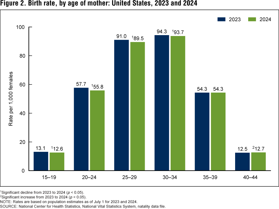 - From 2023 to 2024, the birth rate for women ages 20–24 declined 3%, to 55.8 from 57.7, and the rate for women ages 25–29 declined 2%, from 91.0 to 89.5.