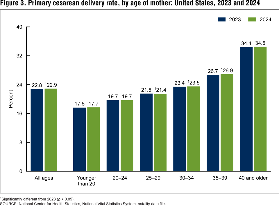 - Primary cesarean delivery rates increased among mothers ages 30–34 (from 23.4% in 2023 to 23.5% in 2024) and 35–39 (26.7% to 26.9%); increases for mothers younger than age 20 and 40–44 were not significant.