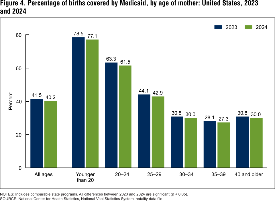 - The percentage of births covered by Medicaid declined for each maternal age group from 2023 to 2024.