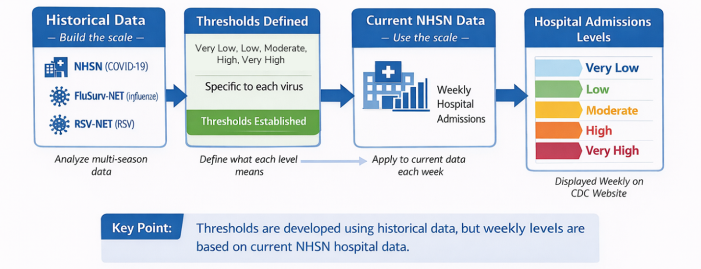 - NHSN provides timely, nationwide reporting from U.S. hospitals, allowing CDC to apply the thresholds consistently each week across all states and virus.