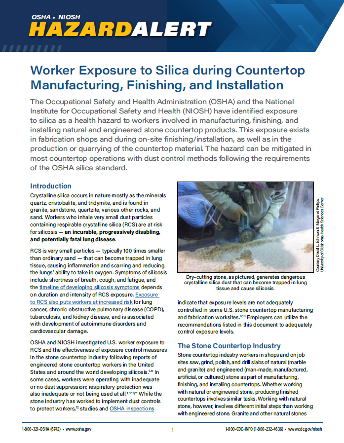This alert provides information to help control countertop workers’ exposures to crystalline silica.