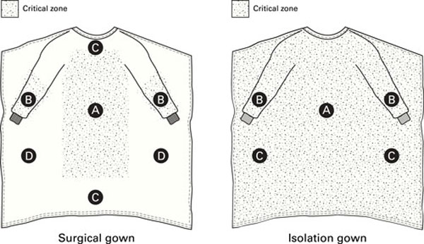 The requirements for the design and construction of surgical and isolation gowns are based on the anticipated location and degree of liquid contact, given the expected conditions of use. ANSI/AAMI PB70:2012 identifies certain areas of surgical and isolation gowns as critical zones (see Figure 3). [ANSI 2012] The critical zones include those areas where direct contact with blood, body fluids, and/or OPIM is most likely to occur—even though the areas outside of critical zones can inadvertently be splashed or sprayed as well. According to the standard, for isolation gowns the whole garment is considered a critical zone due to the unpredictable types of potential contact with blood, body fluids, and OPIM. The entire isolation gown, including the seams, but excluding the cuffs, hems, and bindings, must achieve claimed barrier performance. Open-backed isolation gowns do not meet the critical area parameters, and therefore they cannot be rated. For surgical gowns, the critical zone comprises at least the front panel (area A) and lower sleeves (area B) (Figure 3). The classification of the surgical gown is based on the lower performing component of the two. According to the standard, the back of the gown (area D) can be non-protective. However, the entire front of the gown (areas A, B, and C) is required to have a barrier performance of at least Level 1. Therefore, the areas outside of critical areas in the front of gown (i.e., area C) can be Level 1 even though the whole gown is classified as Level 4 surgical gown. Therefore, using a surgical gown in isolation settings may not provide appropriate protection.