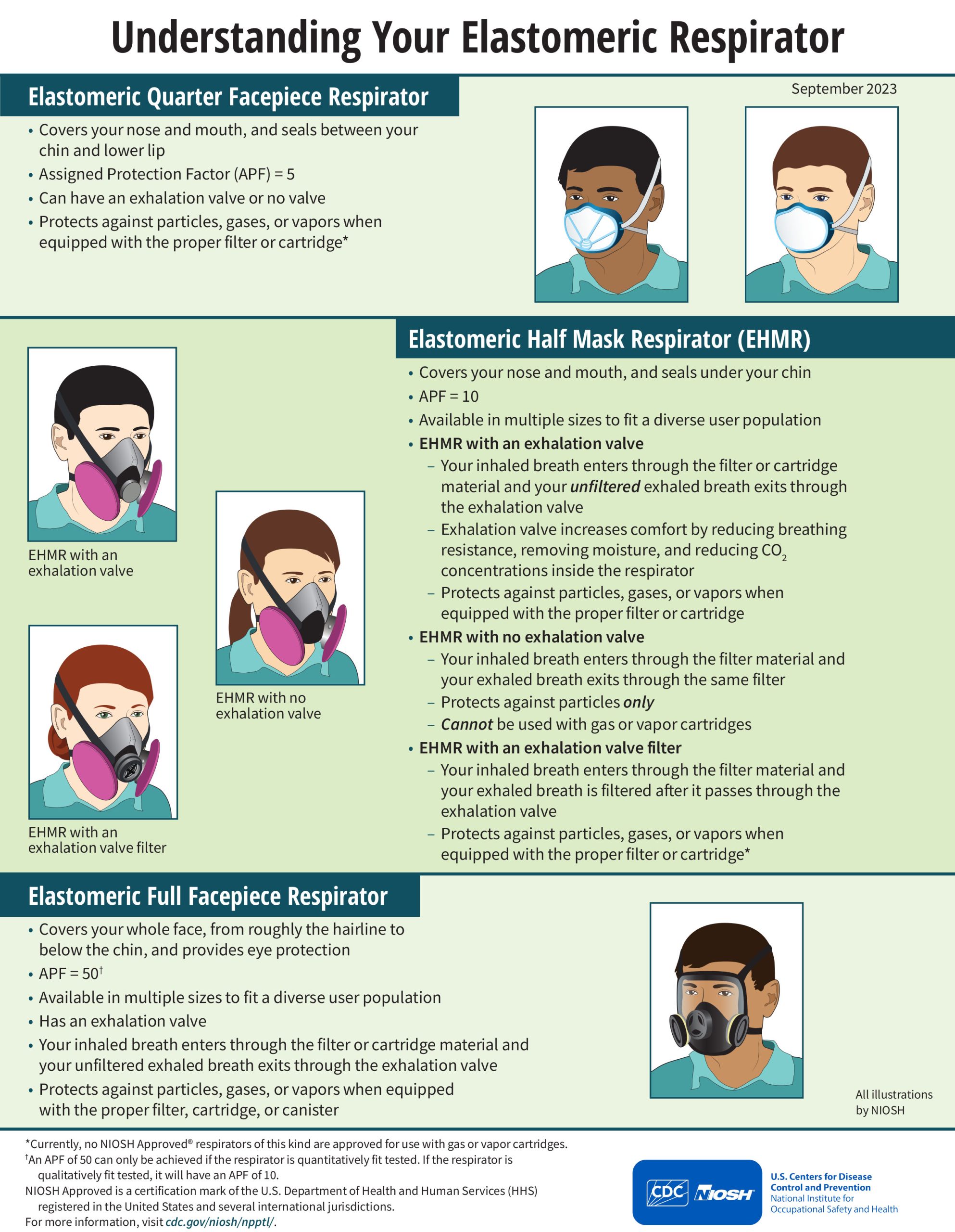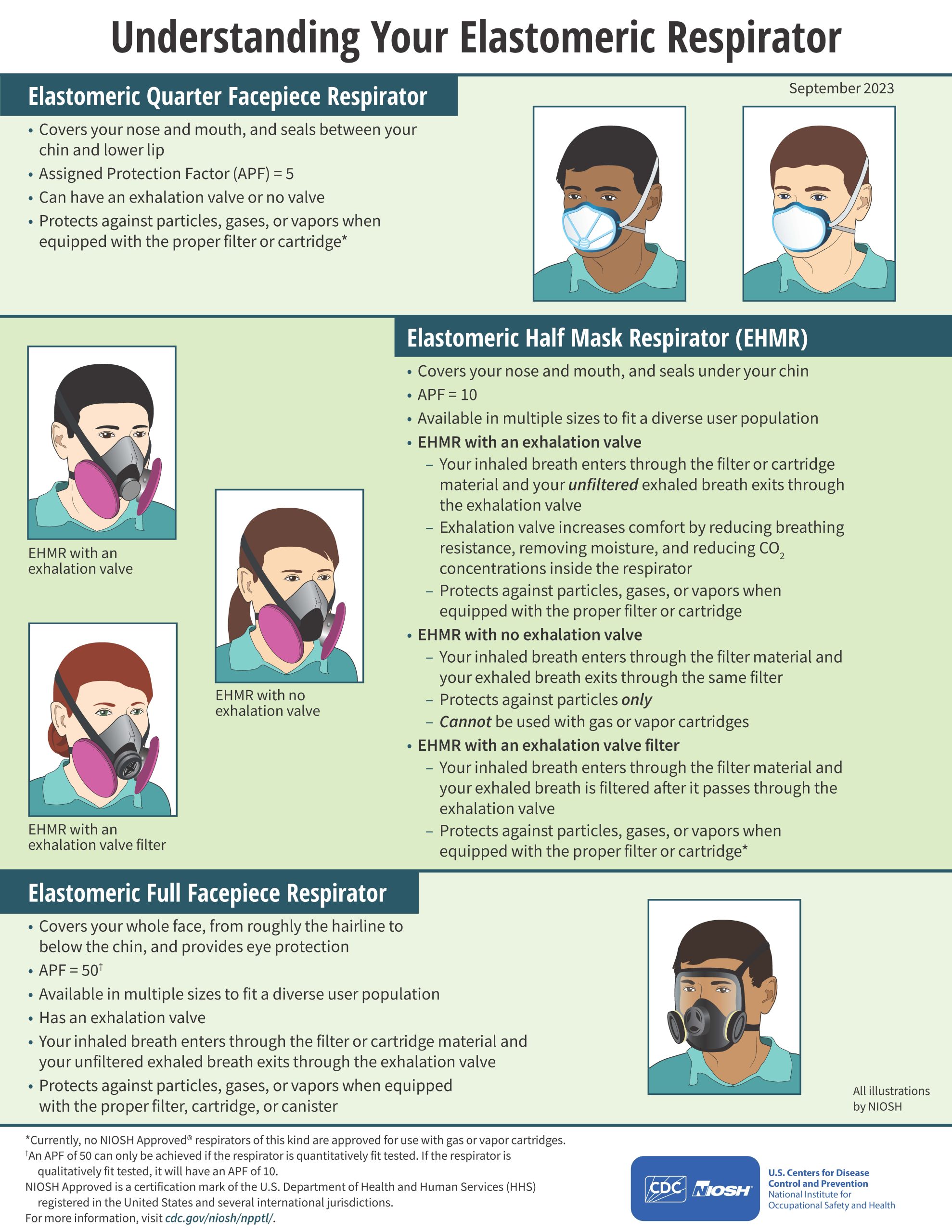 Elastomeric respirators protect against gases, vapors, and particles if equipped with the appropriate filters, cartridges, or canisters. To protect workers from hazardous particles, elastomeric respirators can be equipped with the same nine filter classes as filtering facepiece respirators.