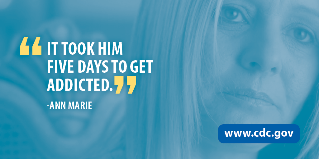 This image from Ann Marie’s story can be used on X (Twitter) to help raise awareness about the risks of prescription opioids. It features her quote, “It took him five days to get addicted.”