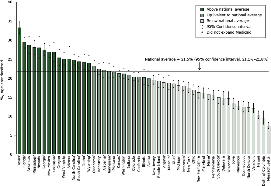 En comparación con la prevalencia nacional ajustada por edad de la falta de seguro médico (21.5 %), 24 estados presentaron tasas menores de personas sin seguro (con una variación del 7.5 % en Massachusetts al 19.5 % en Nueva Jersey), 12 estados presentaron tasas equivalentes de personas sin seguro (con una variación del 19.9 % en Alaska al 23.1 % en Oklahoma) y 15 estados presentaron tasas mayores de personas sin seguro (con una variación del 23.9 % en Wyoming al 33.2 % en Texas) (Figura 1).