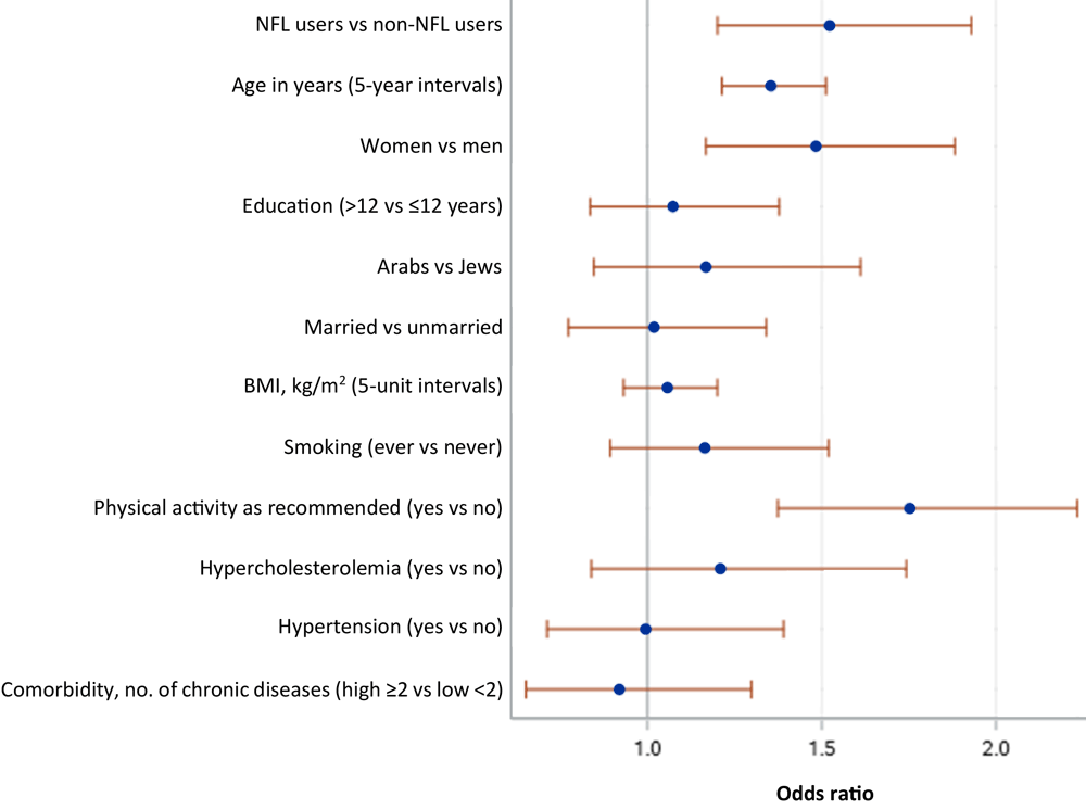 Compared with 1,648 non-NFL users, NFL users (n = 931) were older and more educated, with higher proportions of women, Jews, and nonsmokers (Table 1). NFL users exhibited significantly higher levels of physical activity, prevalence of hypercholesterolemia, prevalence of comorbidities (≥2 chronic diseases), and proportion of adults living above the poverty line. The groups showed similarities in BMI distribution and the prevalence of chronic diseases such as type 2 diabetes, CHD, stroke, thyroid disease, asthma, anemia, osteoporosis, malignancy, and Parkinson disease. Demographic and health characteristics based on DASH accordance can be found at https://doi.org/10.6084/m9.figshare.29145452.v4. A significantly higher prevalence of DASH accordance was found among women and among people with hypertension, high BMI, thyroid disease, diabetes, and comorbidities.