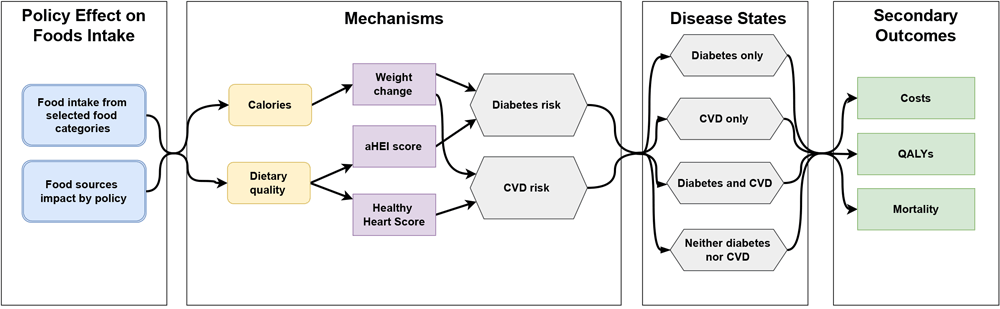 Food and nutrition policy simulation models have recently gained a foothold in the published literature (4). The models of Basu et al (5), Basu et al (6), and Mozaffarian et al (7) are microsimulation models estimating the risk of diabetes and cardiovascular disease (CVD) mortality caused by changes in nutrition policy in the Supplemental Nutrition Assistance Program. Long et al (8) and Lee et al (9) estimate the impact of national excise taxes on sugar-sweetened beverages (SSBs) on CVD risk.