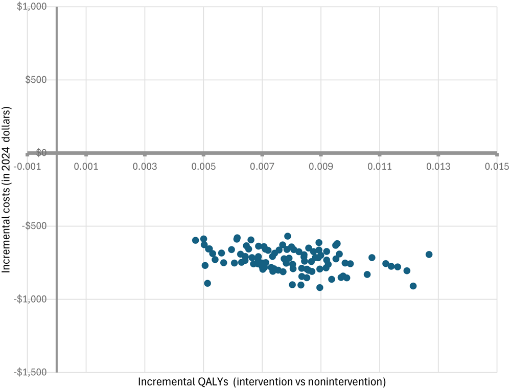 | Nationally representative baseline | −$683 (−860 to −576) | 0.0068 (0.0046 to 0.0132) | Cost savings |