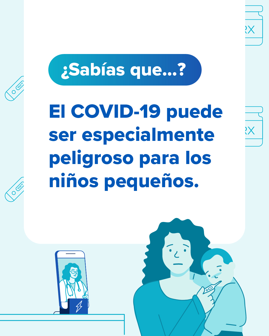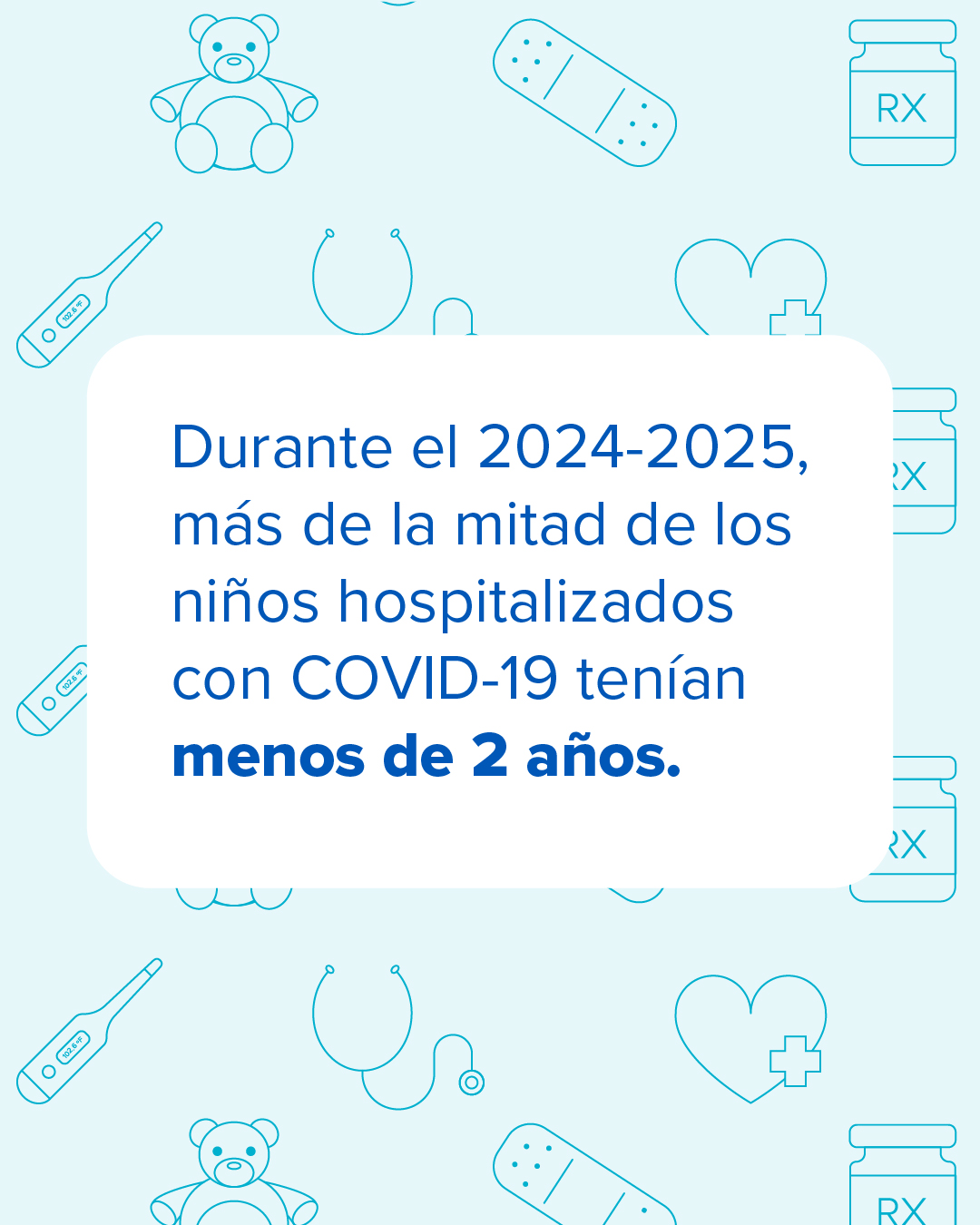 Padres: la salud de su hijo es su prioridad principal, y su médico comparte el mismo compromiso. Hablen con el médico de su hijo si tienen preguntas acerca de las recomendaciones de vacunación para los virus respiratorios, como el del COVID-19. Infórmense más sobre las mejores maneras de proteger a su hijo de enfermedades respiratorias en https://bit.ly/466RQ1g