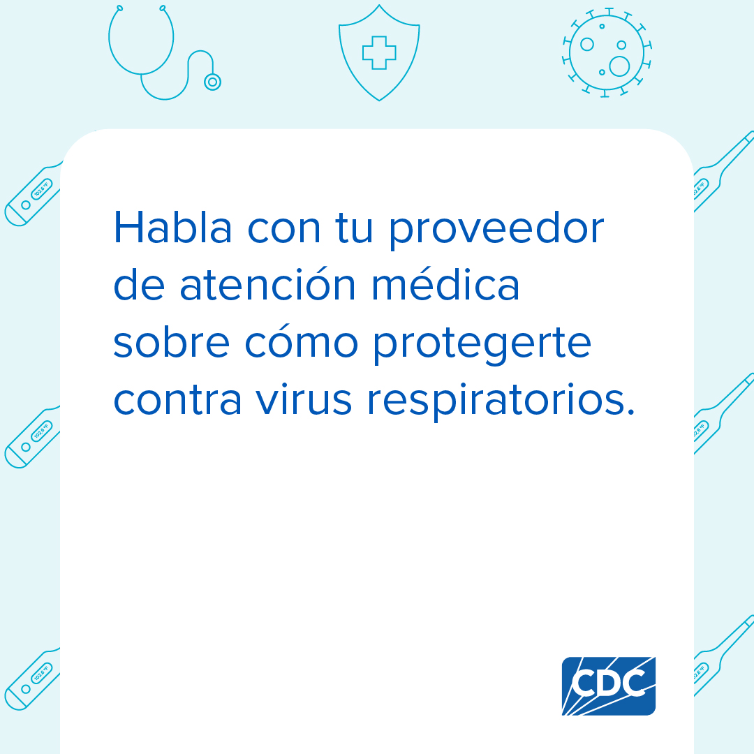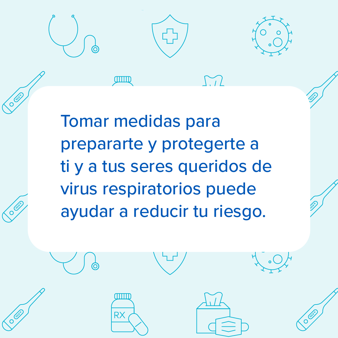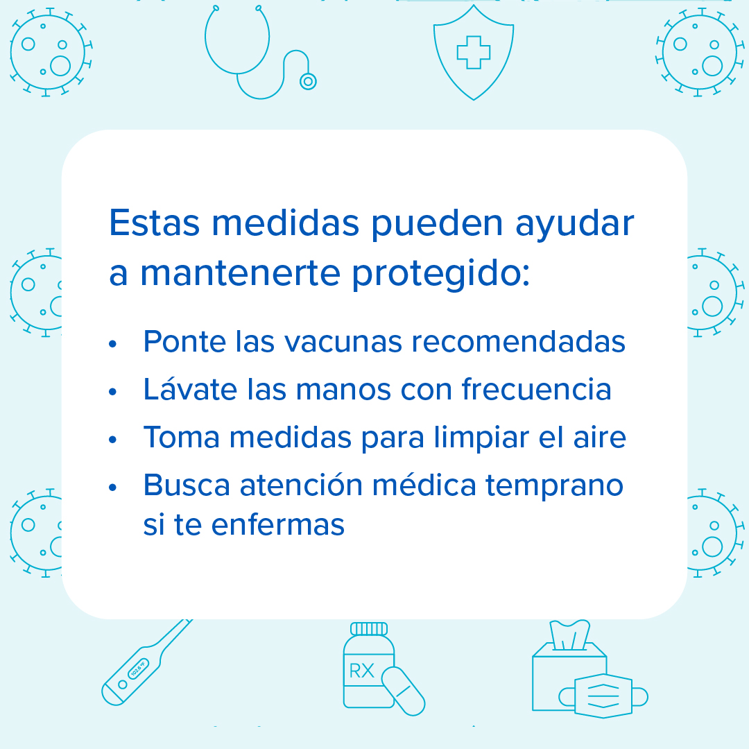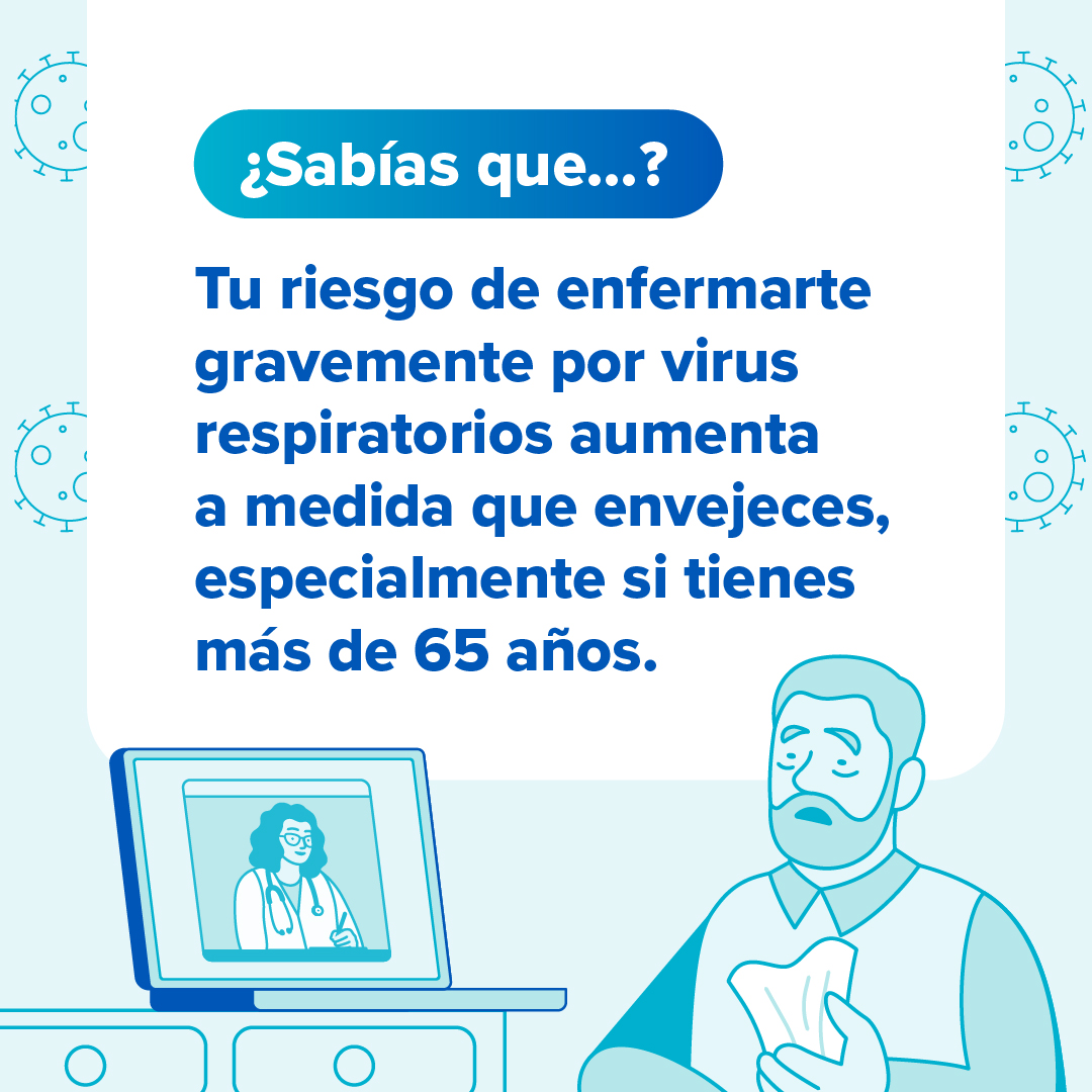 Si tienes 65 años o más, es importante estar al tanto de tu riesgo de contraer enfermedades respiratorias. La buena noticia es que hay medidas que puedes tomar para reducir tu riesgo. Habla con tu proveedor de atención médica para ponerte al día con las vacunas recomendadas. Encuentra información sobre otras formas en las que te puedes proteger de virus respiratorios en https://bit.ly/3I1Pd7H