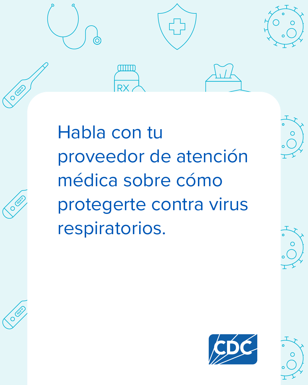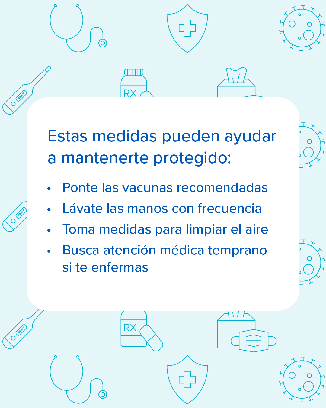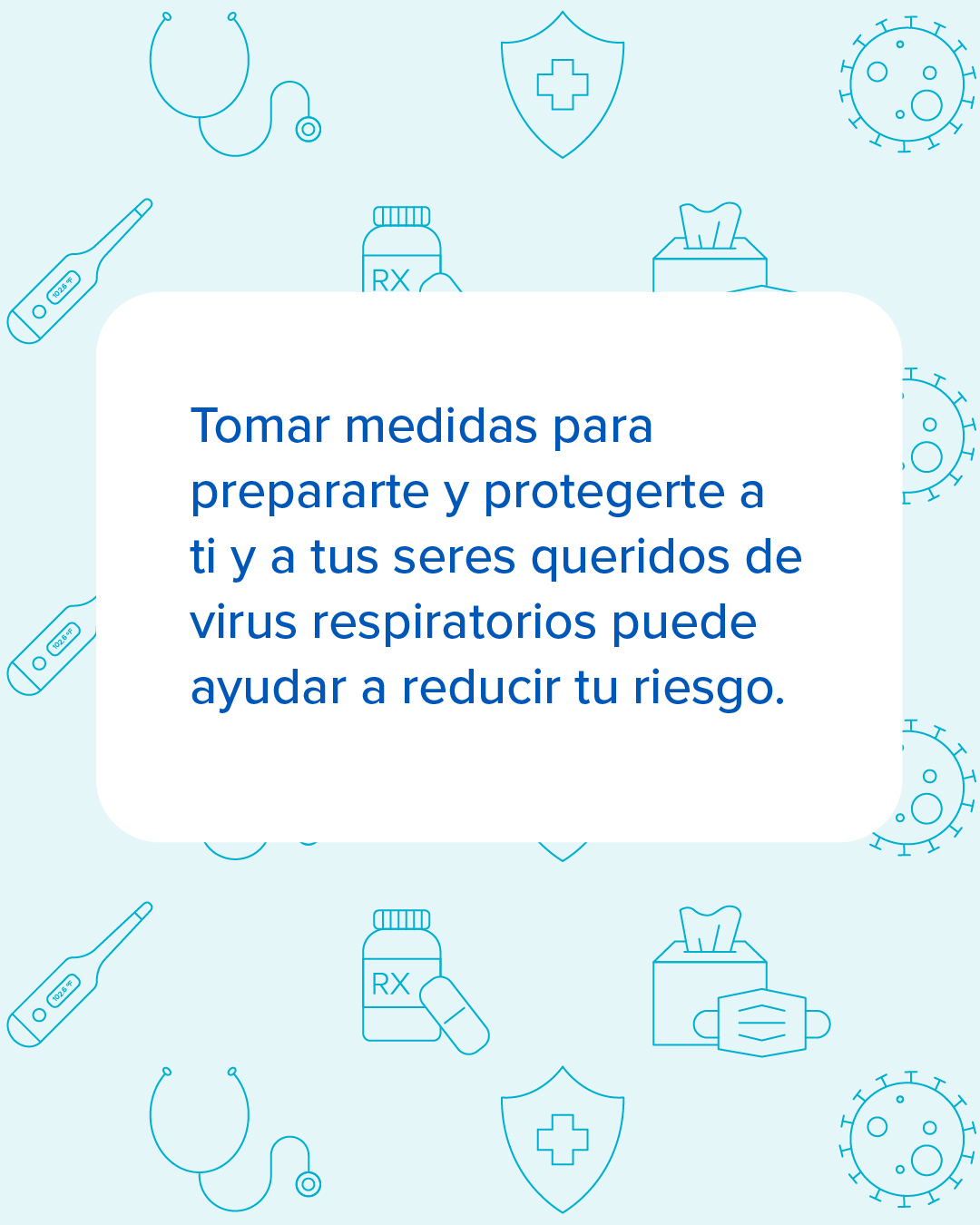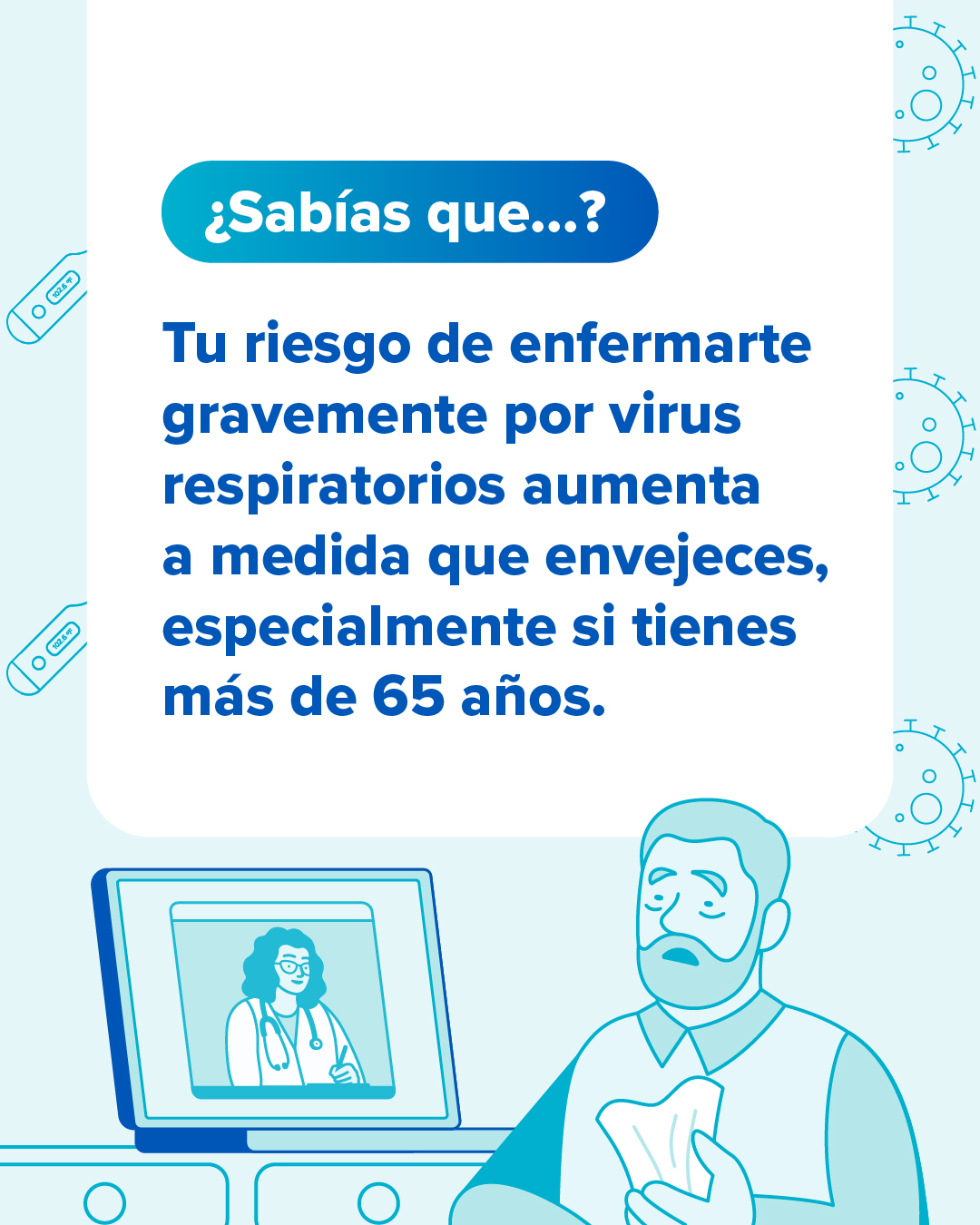 Si tienes 65 años o más, es importante estar al tanto de tu riesgo de contraer enfermedades respiratorias. La buena noticia es que hay medidas que puedes tomar para reducir tu riesgo. Habla con tu proveedor de atención médica para ponerte al día con las vacunas recomendadas. Encuentra información sobre otras formas en las que te puedes proteger de virus respiratorios en https://bit.ly/3I1Pd7H