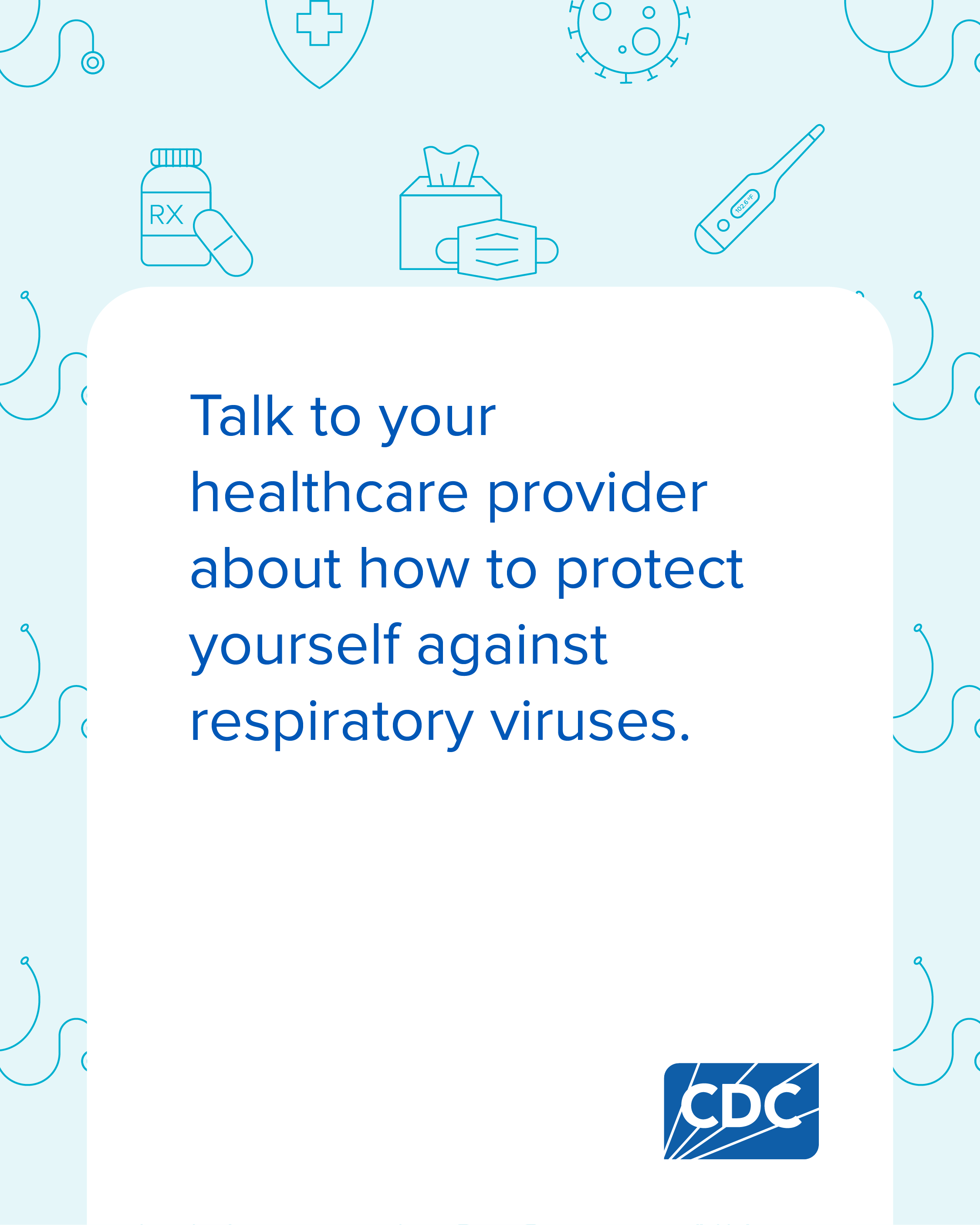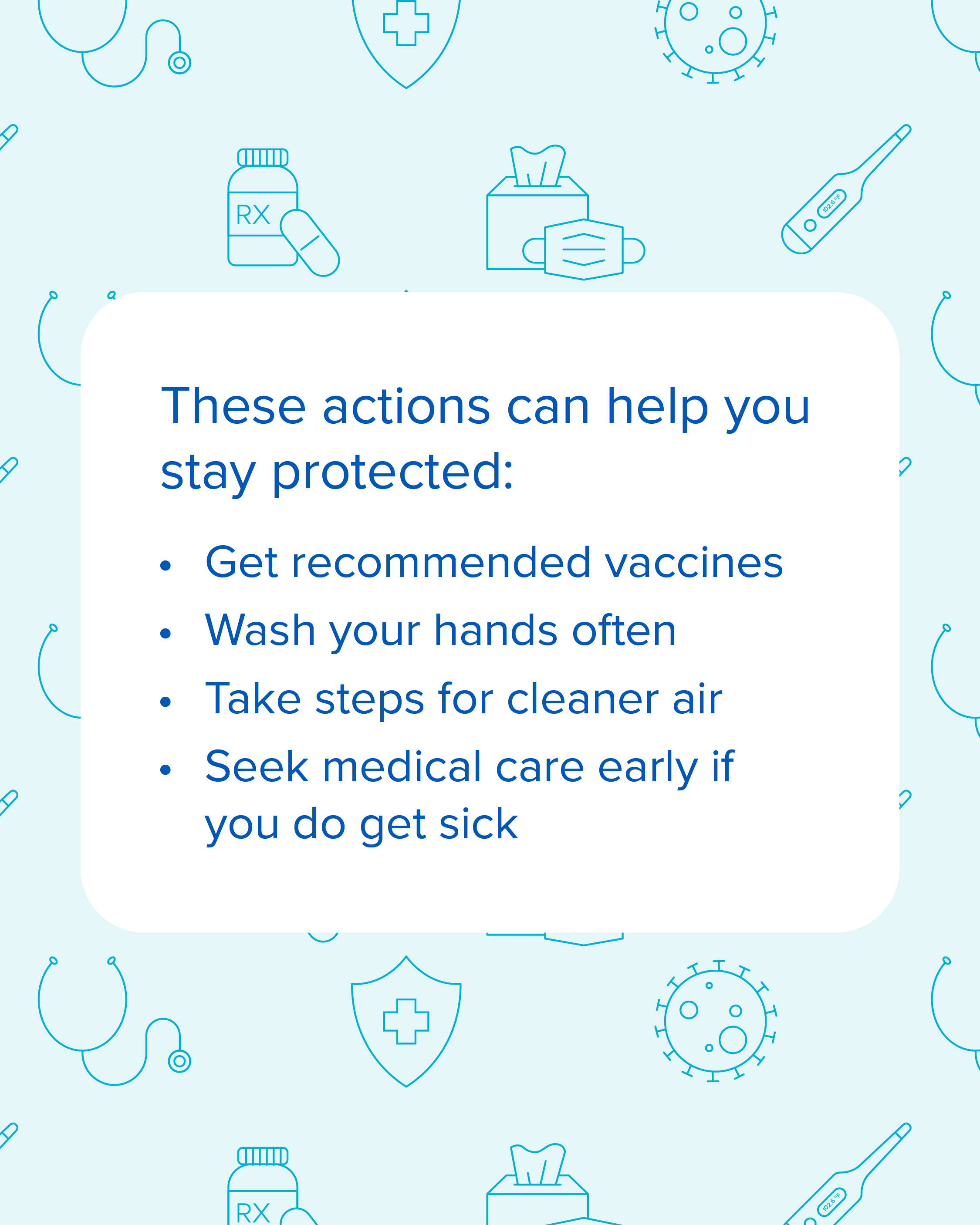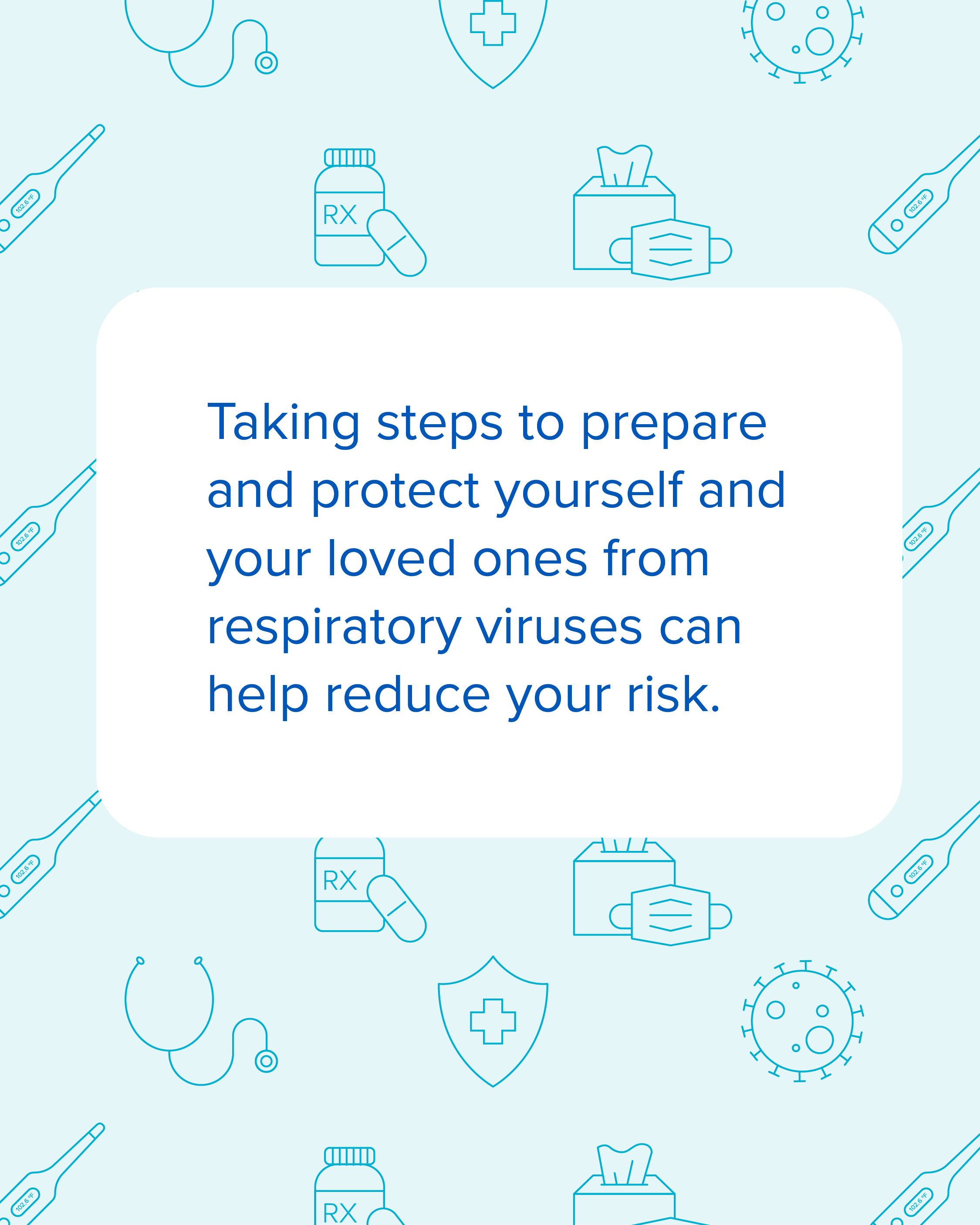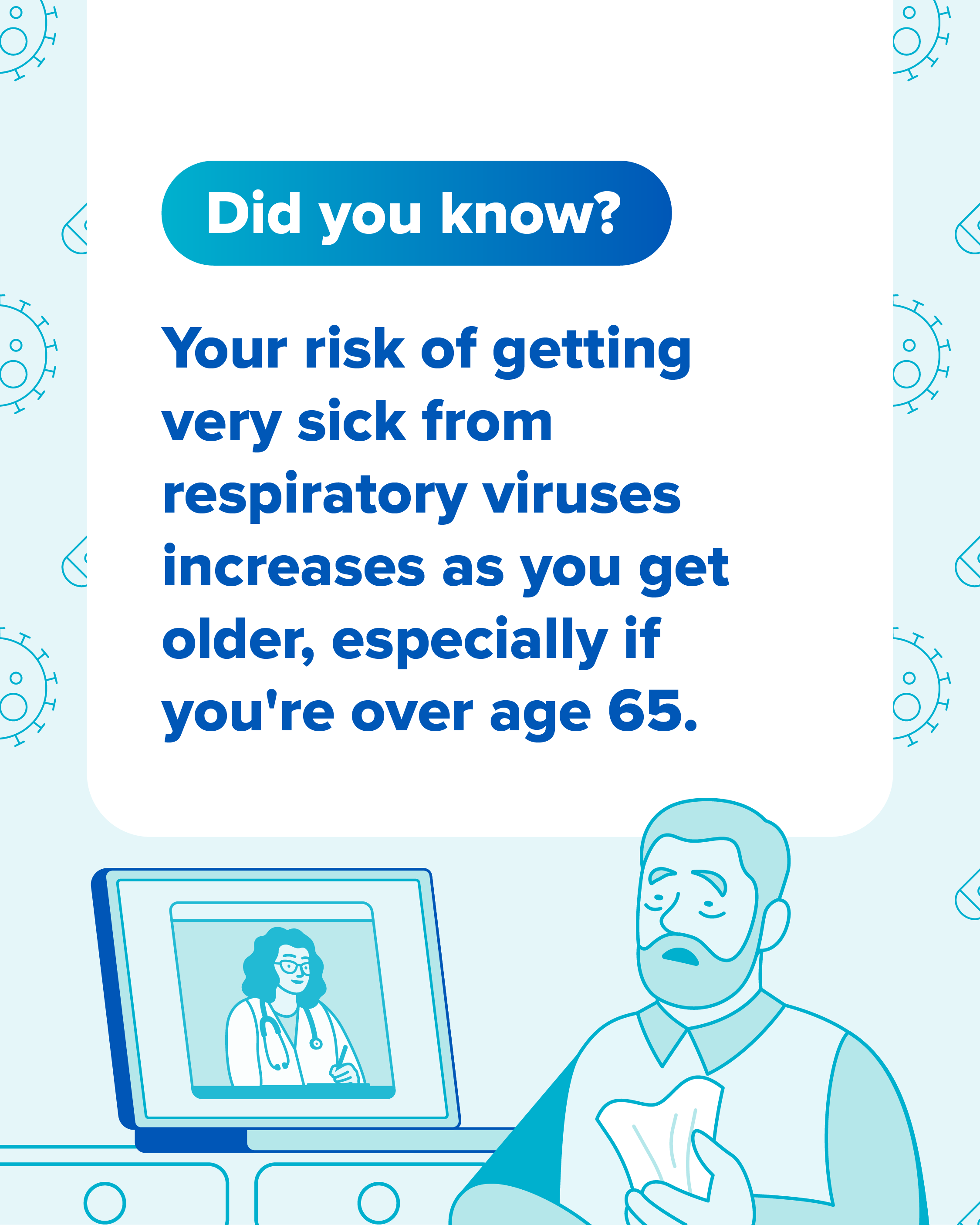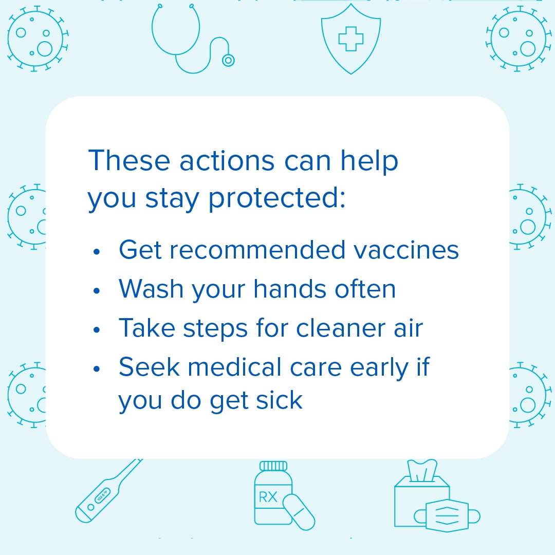 If you're 65 years or older, it's important to be aware of your risk for respiratory illnesses. The good news is there are steps you can take to help reduce your risk. Talk to your healthcare provider about staying up to date on recommended vaccines. Find information on other ways to protect yourself from respiratory viruses at https://bit.ly/45eCzcL