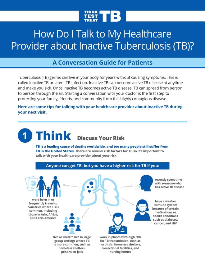 The Think. Test. Treat TB campaign includes several patient education materials. Use and share these patient education materials to provide information on tuberculosis (TB) and the importance of TB testing and treatment.