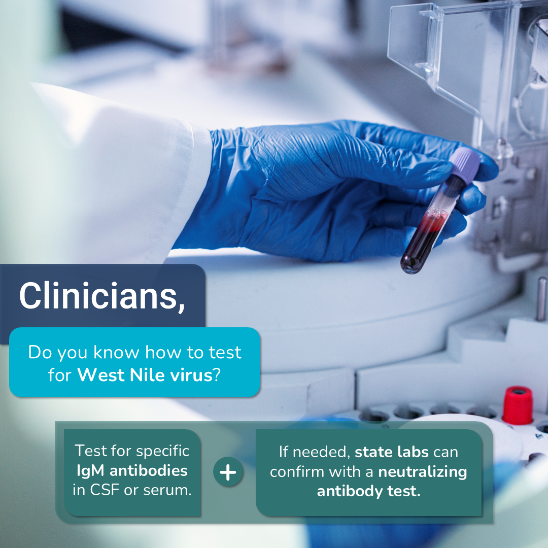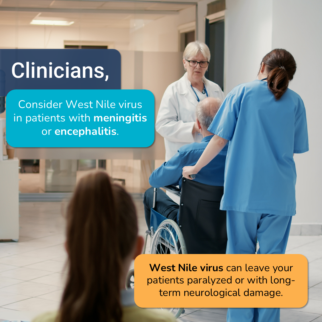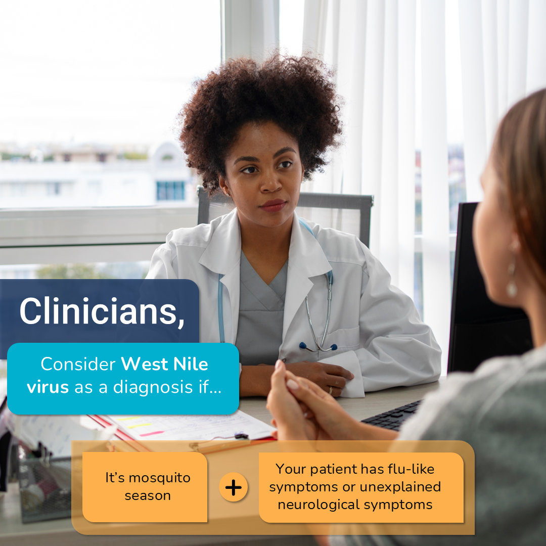 Mosquito season is here, and West Nile virus was just detected in [LOCATION(S)]. Clinicians, keep an eye out for patients with a febrile or neurologic illness and history of possible exposure to mosquitoes. Counsel patients to prevent mosquito bites. Clinical Signs and Symptoms of West Nile Virus Disease | West Nile Virus | CDC