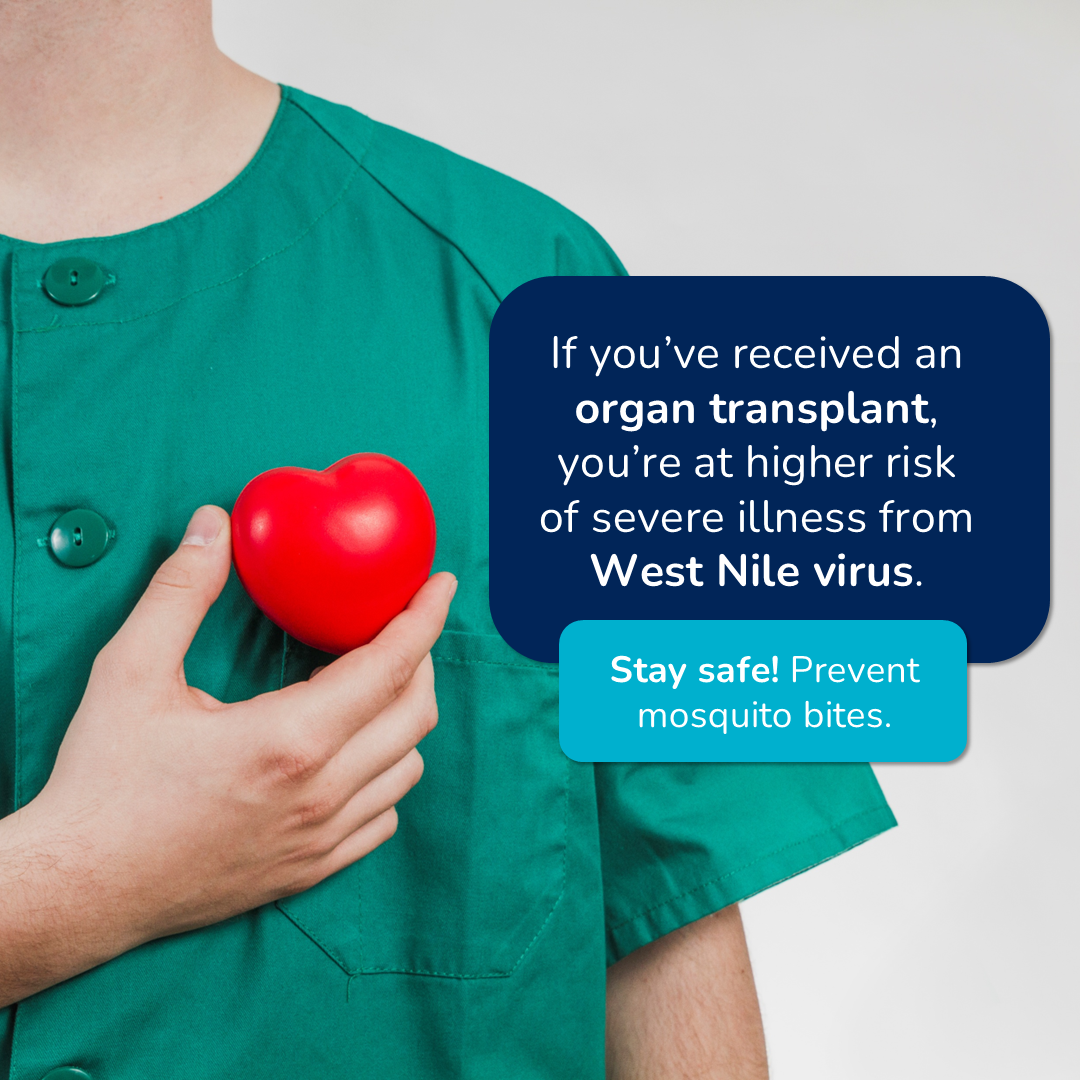 Having an organ transplant increases your risk of severe West Nile virus illness because the medicines you take weaken your immune system. Use EPA-registered insect repellent and take other steps to prevent mosquito bites. Preventing West Nile | West Nile Virus | CDC
