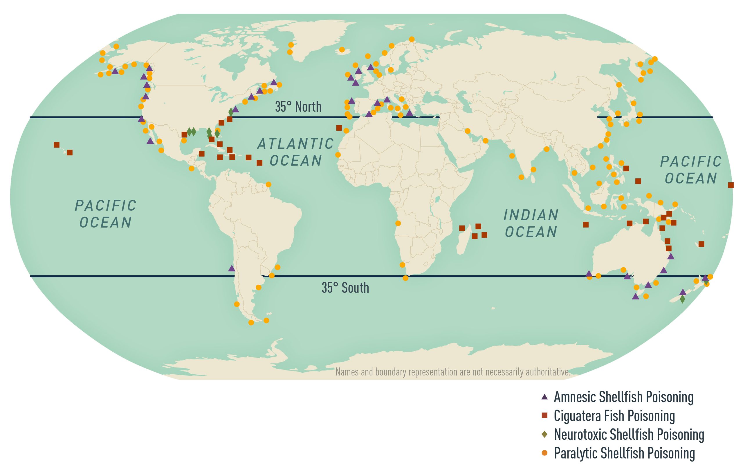 Poisoning from ingesting marine toxins is an underrecognized hazard for travelers, particularly in the tropics and subtropics (Table 3.8.1). Climate change, coral reef damage, expanding international trade and tourism, growing seafood consumption, and spread of toxic algal blooms are all contributing to an increasing risk (Map 3.8.1).