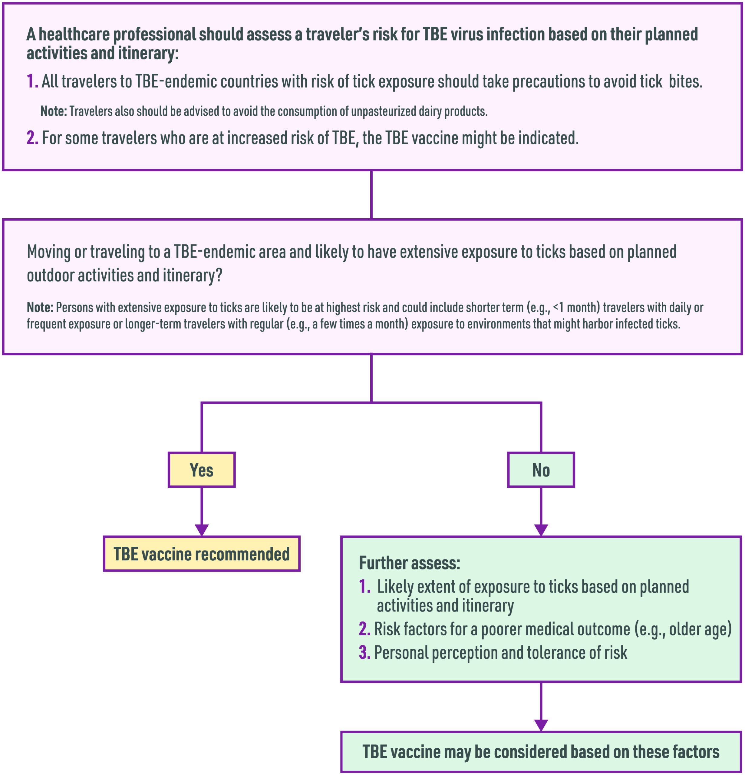 In 2022, the Advisory Committee on Immunization Practices approved recommendations for vaccine use among people traveling or moving to a TBE-endemic area. The vaccine is recommended for persons who will have extensive tick exposure based on planned outdoor activities and itinerary. In addition, TBE vaccine may be considered for people traveling or moving to a TBE-endemic area who might engage in outdoor activities in areas where ticks are likely to be found, with the decision to vaccinate based on an assessment of planned activities and itinerary, risk factors for a poor medical outcome, and personal perception and tolerance of risk. The risk-benefit assessment for vaccination should consider several factors (Box 4.18.2; Figure 4.18.1).