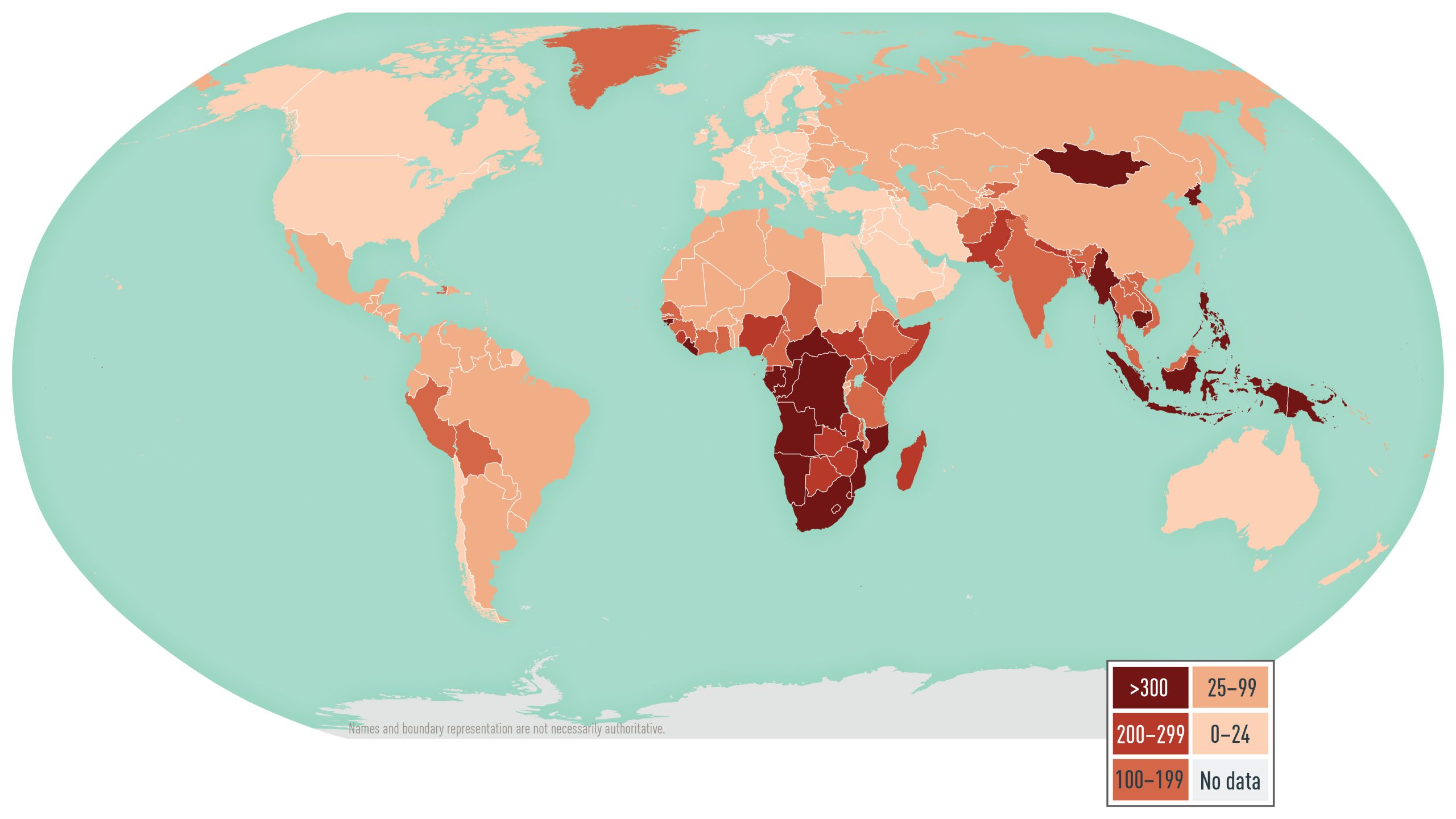 According to the WHO, approximately 10.6 million new TB cases and 1.3 million TB-related deaths occurred in 2022. The number of cases decreased from 2019 through 2021 while the number of deaths increased during the COVID-19 pandemic. However, in 2022, the number of cases rebounded in the majority of countries to at least 2019 levels and deaths decreased. TB occurs throughout the world, but the incidence varies (Map 4.19.1). In some countries in Sub-Saharan Africa and Asia, the annual incidence is several hundred per 100,000 population. In the United States, the annual incidence is <3 per 100,000 population, but immigrants from countries with a high TB burden and long-term residents of high-burden countries have a 10 times greater incidence of TB than the U.S. national average. Of note, U.S. surveillance does not capture travel-related cases of TB.