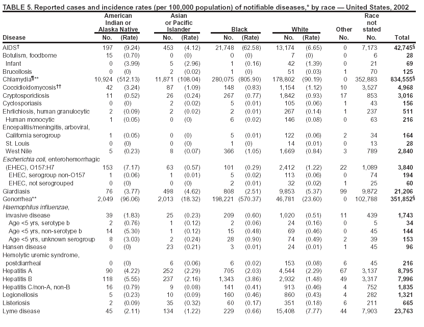 * Because no cases of paralytic poliomyelitis and western equine encephalitis were reported in the United States during 2002, these diseases do not appear in the tables in Part 1.