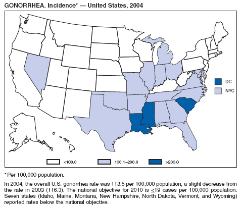 Population estimates for the states are derived from NCHS estimates of the July 1, 2000--July 1, 2003, U.S. resident population from the Vintage 2003 postcensal series by year, county, age, sex, race, and Hispanic origin, prepared under a collaborative arrangement with the U.S. Census Bureau (available at http://www.cdc.gov/nchs/about/major/dvs/popbridge/popbridge.htm). Population numbers for territories are 2003 estimates from the U.S. Census Bureau International Data Base Data Access--Display Mode (available at http://www.census.gov/main/ipc/www/idbprint.html). The choice of population denominators for incidence reported in the MMWR is based on 1) the availability of census population data at the time of preparation for publication and 2) the desire for consistent use of the same population data to compute incidence reported by different CDC programs. Incidence in the Summary is calculated as the number of reported cases for each disease or condition divided by either the U.S. resident population for the specified demographic population or the total U.S. residential population, multiplied by 100,000. When a nationally notifiable disease is associated with a specific age restriction, the same age restriction is applied to the population in the denominator of the incidence calculation. In addition, population data from states in which the disease or condition was not notifiable or was not available were excluded from incidence calculations. Unless otherwise stated, disease totals for the United States do not include data for American Samoa, Guam, Puerto Rico, the U.S. Virgin Islands, or the Commonwealth of the Northern Mariana Islands.