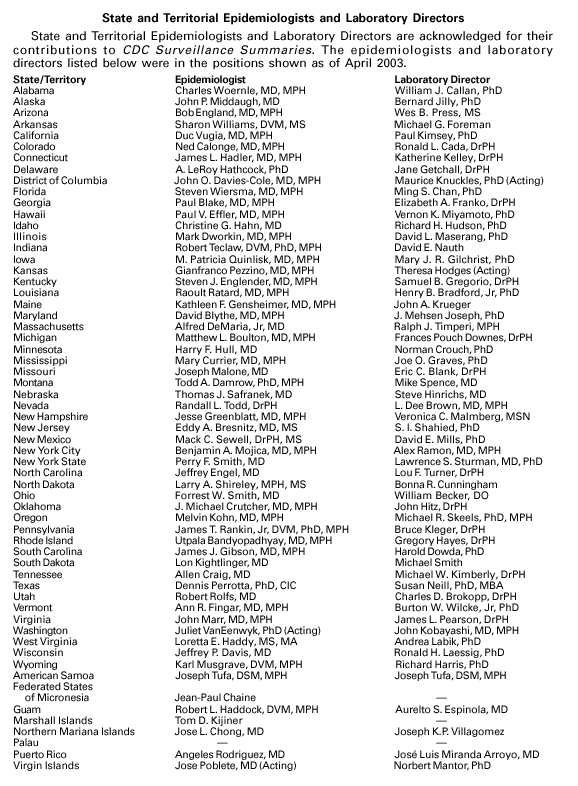 Population estimates for the states are from the April 1, 2000, population estimates from the Population Division, U.S. Bureau of the Census. Population numbers for territories are 2000 estimates from the U.S. Bureau of the Census, International Data Base Data Access Display Mode. More information regarding census estimates is available at http://eire.census.gov/popest/data/states/tables/ST-EST2002-01.php and http:// www.census.gov/ipc/www/idbprint.html. The choice of population denominators for incidence rates reported in the MMWR is based on 1) the consistency in the incidence rates reported by various CDC programs, and 2) the availability of census population data at the time of preparation for MMWR publications. Rates in the Summary are presented as incidence rates per 100,000 population, based on data for the U.S. total-resident population. However, population data from states in which diseases were not notifiable or disease data were not available were excluded from rate calculations.