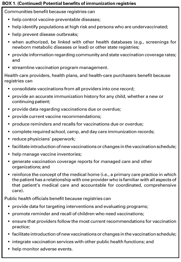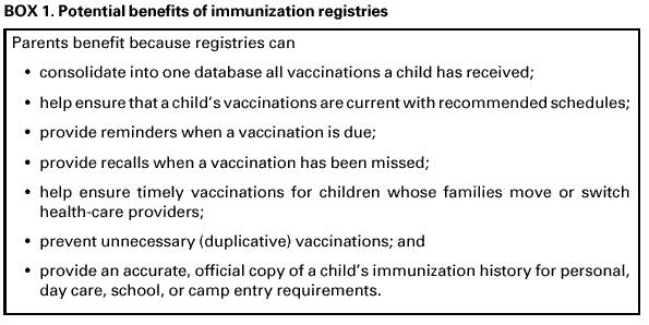 Together, these factors cause difficulty for parents and providers in determining a child's immunization status and ensuring that each child gets needed vaccinations. Families, providers, and schools need definitive documentation of childhood vaccinations, and communities and public health programs require accurate coverage estimates. Community- and state-based immunization registries are a critical tool for increasing and sustaining vaccination coverage; therefore, one Healthy People 2010 objective is to increase to 95% the proportion of children aged <6 years who participate in fully operational, population-based immunization registries (17). INTRODUCTION What Are Immunization Registries?* Immunization registries are confidential, population-based, computerized systems for maintaining information regarding children's vaccinations. A population-based registry includes the majority of children in a geographic area, regardless of health-care source. Children's names can be entered into the registry at birth (e.g., through a link with electronic birth records) or at first contact with the health-care system. If a registry includes all children in a geographic area and all providers report vaccination and immunization data, the registry can provide a single data source for all community vaccination partners. Registries enable implementing vaccination strategies, and they decrease resources needed to measure, achieve, and maintain increased levels of vaccination coverage. Immunization registries offer potential benefits to parents, communities, health-care systems, and the public health system (Box 1). Efforts to Build U.S. Immunization Registries In 1993, CDC began awarding planning grants to develop immunization registries in every state. These systems were intended to collect immunization histories on all children residing in the states. In 1994, NVAC's Subcommittee on Vaccination Registries recommended expanded funding and new federal policies for a system of immunization registries to support national goals. Since 1994, CDC has allocated $181.3 million for the development and implementation of a nationwide network of community- and state-based immunization registries to its 64 immunization grantees (i.e., 50 states, the District of Columbia, Chicago, Houston, New York City, Philadelphia, San Antonio, American Samoa, Guam, Marshall Islands, Micronesia, Northern Mariana Islands, Palau, Puerto Rico, and the U.S. Virgin Islands) that receive federal vaccination funds under section 317 of the Public Health Service Act. Private foundations have also contributed funds for immunization registry development, including approximately $20 million from the Robert Wood Johnson Foundation. As of December 2000, a total of 39 (61%) of 64 grantees reported operating population-based immunization registries that targeted their entire catchment areas, and an additional 25 (39%) grantees reported developing population-based immunization registries. In 2000, an estimated 24% of children aged <5 years participated in a population-based immunization registry (CDC, unpublished data, 2001). NVAC's Initiative on Immunization Registries In 1998, NVAC launched the Initiative on Immunization Registries to facilitate community- and state-based immunization registry development in the United States. Through public hearings and parent focus groups, NVAC's members and consultants to the Initiative on Immunization Registries identified four challenges that needed to be addressed to increase registry participation and to provide a framework for their recommendations: