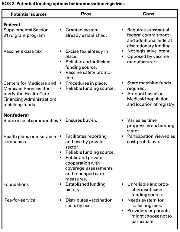 CDC Activities Limited information is available regarding immunization registry costs. An AKC study of 16 immunization registry projects in 1997 estimated that the cost of maintaining immunization registries was approximately $3.91/child/year, or approximately $94 million/year nationally to enroll all children aged <6 years and keep them in the registry to age 6 years (23). Similarly, a 1998 CDC study of three registries estimated an average annual cost of $3.38--$6.15/child/year, or national costs of $81.1--$147.6 million/year. Additional 1999 CDC-collected data from 24 registries estimated an annual cost of $5.18/child, and an annual national cost of $124.3 million. This study also determined that only 40% of registry costs were funded by federal sources. Registries offer potential cost savings. Estimated annual fiscal savings of >$270 million associated with registries include costs of manually pulling medical records in provider offices for school or day care entry ($58.0 million); costs of manually pulling medical records in provider offices for changes in primary providers ($16.2 million); costs of duplicative vaccination ($26.5 million); costs of pulling records to fulfill managed care reporting requirements ($2 million); and school system review of immunization records ($168.0 million) (24--26). Registries might also reduce or offset costs by reducing vaccine-preventable disease morbidity and mortality through improved coverage, providing a means for assessing coverage at the local level, and decreasing the incidence of vaccine adverse events through the identification of children who have vaccine contraindications. Involvement of all stakeholders in considering funding sources for registries will be critical (Box 2). In 2000, the Centers for Medicare and Medicaid Services (formerly the Health Care Financing Administration) agreed to fund approximately 90% of registry development costs for Medicaid recipients. Although certain states have taken this funding opportunity, other sources need to be identified for a long-term funding solution. OTHER REGISTRY-RELATED CONCERNS Despite potential benefits of registries to vaccination coverage, program operations, cost-savings, and parental support, immunization registries have critics and opponents. In 1994, a congressional initiative to establish population-based immunization registries throughout the country was proposed. Opponents successfully argued against establishing a national immunization information database. Consequently, efforts to establish state- and community-based immunization registries were begun and have since resulted in the development of state and local registries with different capabilities, legal authority, and success. Concerns regarding immunization registries and their recommended uses remain, including