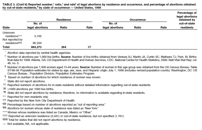 Persons using assistive technology might not be able to fully access information in this file. For assistance, please send e-mail to: mmwrq@cdc.gov. Type 508 Accommodation and the title of the report in the subject line of e-mail. Abortion Surveillance---United States, 1998Joy Herndon, M.S. Abstract Problem/Condition: In 1969, CDC began abortion surveillance to document the number and characteristics of women obtaining legal induced abortions, to monitor unintended pregnancy, and to assist efforts to identify and reduce preventable causes of morbidity and mortality associated with abortions. Reporting Period Covered: This report summarizes and reviews information reported to CDC regarding legal induced abortions obtained in the United States in 1998. Description of System: For each year since 1969, CDC has compiled abortion data by occurrence. From 1973 to 1997, data were received from or estimated for 52 reporting areas in the United States: 50 states, the District of Columbia, and New York City. In 1998, CDC compiled abortion data from only 48 reporting areas; Alaska, California, New Hampshire, and Oklahoma did not report. Results: In 1998, 884,273 legal induced abortions were reported to CDC, representing a 2% decrease from the 900,171 legal induced abortions reported by the same 48 reporting areas for 1997. The abortion ratio, defined as the number of abortions per 1,000 live births, was 264, compared with 274 in 1997 (for the same 48 areas); the abortion rate for these 48 areas was 17 per 1,000 women aged 15--44 years for both 1997 and 1998. The availability of information about characteristics of women who obtained an abortion in 1998 varied by state and by the number of states reporting each characteristic. The total number of legal induced abortions by state is reported by state of residence and state of occurrence; characteristics of women obtaining abortions in 1998 are reported by state of occurrence. Women undergoing an abortion were likely to be young (i.e., age <25 years), white, and unmarried; slightly more than one half were obtaining an abortion for the first time. Of all abortions for which gestational age was reported, 56% were performed at <8 weeks of gestation, and 88% were performed before 13 weeks. Overall, 19% of abortions were performed at the earliest weeks of gestation (<6 weeks), 18% at 7 weeks, and 19% at 8 weeks. From 1992 (when this information was first collected) through 1998, an increasing percentage of abortions were performed at the very early weeks of gestation. Few abortions were provided after 15 weeks of gestation; 4% were obtained at 16--20 weeks, and 1.4% were obtained at >21 weeks. A total of 24 reporting areas submitted information stating that they performed medical (nonsurgical) procedures (two of these areas categorized medical abortions with "other" procedures), making up <1% of all procedures reported from all states. From 1993 through 1997 (years for which data have not been published previously and the most recent years for which such data are available), 36 women died as a result of complications from known legal induced abortion, and three deaths were associated with known illegal abortion. The annual case-fatality rate of legal induced abortion ranged from 0.3 to 0.8 abortion-related deaths per 100,000 reported legal induced abortions. Interpretation: From 1990 through 1995, the number of abortions declined each year; in 1996, the number increased slightly, but in 1997, it declined to its lowest level since 1978. In 1998, the number of abortions continued to decrease when comparing the 48 reporting areas. In 1997, as in previous years, deaths related to legal induced abortions occurred rarely. Public Health Actions Taken: The number and characteristics of women who obtain abortions in the United States should continue to be monitored so that trends in induced abortion can be assessed and efforts to prevent unintended pregnancy can be evaluated. IntroductionIn 1969, CDC began conducting abortion surveillance to document the number and characteristics of women obtaining legal induced abortions, to monitor unintended pregnancy, and to assist efforts to identify and reduce preventable causes of morbidity and mortality associated with abortions. This report is based on abortion data for 1998 provided to CDC's National Center for Chronic Disease Prevention and Health Promotion (NCCDPHP), Division of Reproductive Health. MethodsFor 1998, CDC compiled data that were voluntarily provided from 48 reporting areas in the United States: 46 states (excluding Alaska, California, New Hampshire, and Oklahoma), the District of Columbia, and New York City. Legal induced abortion was defined as a procedure, performed by a licensed physician or someone acting under the supervision of a licensed physician, that was intended to terminate a suspected or known intrauterine pregnancy and to produce a nonviable fetus at any gestational age (1,2). The total number of legal induced abortions was available from all reporting areas; however, not all of these areas collected information regarding some or all the characteristics of women who obtained abortions. Because these data are reported voluntarily, several limitations exist: 1) data are reported by the state in which the abortion was performed (state of occurrence); 2) data for states that do not report were not estimated for 1998 but were estimated before 1998; and 3) data provided to state or area health departments by providers may be incomplete. Therefore, the rates and ratios in this report may reflect an undercount of abortions for some states with more stringent legal requirements for obtaining an abortion (causing women to seek abortions elsewhere) and may be an overrepresentation for some states that have many out-of-state women obtaining legal induced abortions (3). The availability of information about characteristics of women who obtained an abortion in 1998 varied by state. Most reporting areas (4