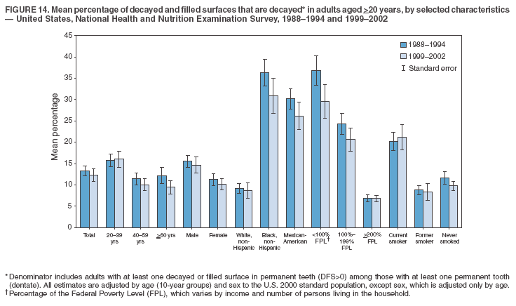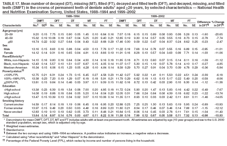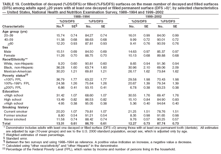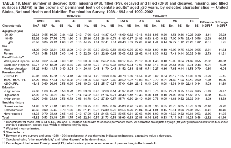 Dentate adults aged >20 years had a mean of 8.0 decayed and filled permanent teeth (DFT) (Table 17) and 20.9 decayed and filled permanent surfaces (DFS) (Table 18, Figure 13). Dentate non-Hispanic white adults had a higher mean DFS (23.1) than Mexican-American (13.9) and non-Hispanic black (12.1) adults. Dentate adults with family income >200% of the FPL had a higher mean DFS (23.1) than those with lower income (15.9 and 14.5). Education level was directly correlated with mean DFS (24.1 surfaces among those with more than a high school education, 19.4 surfaces among those with a high school education, and 14.2 surfaces among those with less than high school education) but inversely correlated with mean number of untreated decayed surfaces (Table 18). The mean DFS among dentate adults decreased from 23.5 surfaces in 1988--1994 to 20.9 surfaces in 1999--2002. The largest decreases were observed among adults aged 20--39 years and those with more than a high school education (approximately four surfaces) (Table 18).