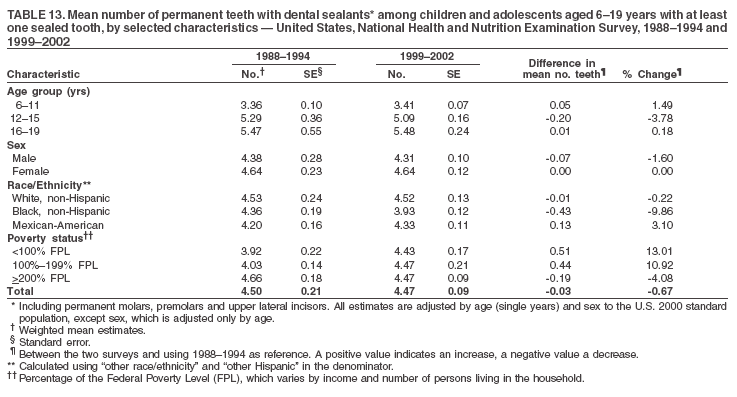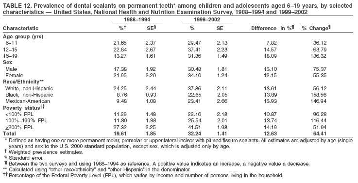The increased prevalence of sealants from 1988--1994 to 1999--2002 was observed across all sociodemographic groups and might have contributed to the reported decrease in dental caries in permanent teeth. Data from this report also suggest that disparities by race/ethnicity and income, as related to sealant use, might be decreasing. The proportional increase in sealant prevalence among racial/ethnic minorities was about three times that of non-Hispanic white children and adolescents, and the proportional increase among lower income children and adolescents was almost twice that of their counterparts in families with higher incomes.