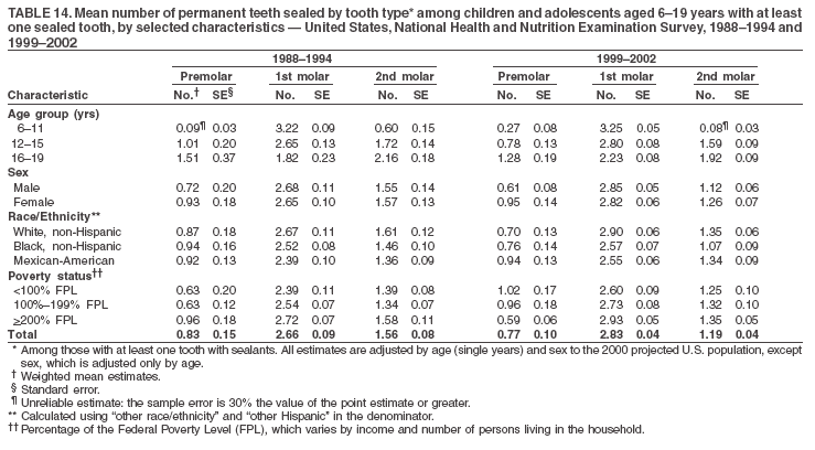 The age categories used correspond generally to survey sampling domains (<5 years, 6--11 years, 12--19 years, 20--39 years, 40--59 years, and >60 years). The target population for the oral examination began at age 2 years. Adolescents aged 12--19 years were divided into two groups (12--15 years and 16--19 years) because the former category is the target age for placing sealants on second molars. Race/ethnicity was categorized as non-Hispanic white, non-Hispanic black, and Mexican-American. Estimates were not shown separately for persons of other race/ethnicity groups, although these persons were included in totals and strata by other characteristics. To minimize the impact of differences in age and sex distribution between surveys, all estimates were adjusted for age and sex to the U.S. 2000 standard population (16), except those stratified by sex, which were adjusted only for age. Data for dental caries and sealants among children and adolescents and enamel fluorosis were adjusted using single years of age. Data for dental caries, tooth retention, and edentulism among adults were adjusted using 10-year age groups. Despite the small difference observed between adjusted and nonadjusted estimates, this report includes adjusted estimates for NHANES 1999--2002 to allow comparisons with NHANES 1988--1994. Technical information on adjustment weights and coding for variable creation is available at the NIDCR/CDC Data Resource Center (DRC) (http://drc.nidcr.nih.gov).
