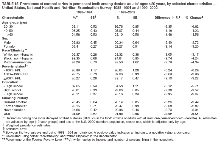 During 1999--2002, declines in caries prevalence and severity in the permanent dentition were observed across all age groups and for certain racial/ethnic groups, poverty level, education, and smoking characteristics when compared with data from 1988--1994. These reductions in dental caries also are reflected in increased tooth retention and reduced levels of edentulism, as has been reported elsewhere for selected populations (28). However, as the population ages and persons retain more teeth, more root surfaces become exposed and are at increased risk for tooth decay (29). These findings highlight the importance of developing strategies for preventing and controlling dental caries in older adults.