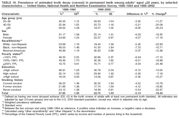 Among dentate adults aged >20 years, 23% had untreated tooth decay (Table 16). The prevalence of untreated tooth decay was higher among males and adults aged 20--39 years. Dentate non-Hispanic white adults had a lower prevalence (18.4%) of untreated tooth decay than Mexican-American (35.9%) and non-Hispanic black (41.3%) adults. Dentate adults with family income >200% of the FPL had a lower prevalence (15.7%) of untreated tooth decay than did those with lower family incomes (35.3% and 40.9%). Prevalence of untreated tooth decay was inversely correlated with higher level of education; prevalence was 40.9% among those with less than a high school education, 29.8% among high school graduates, and 13.6% among those with more than a high school education. Dentate adults who were current smokers had a higher prevalence of untreated tooth decay (35.0%) than did those who never smoked (18.6%) and former smokers (17.7%). Overall, the prevalence of dentate adults with untreated tooth decay decreased 5.1%, from 27.9% in 1988--1994 to 22.7% in 1999--2002. The greatest absolute reductions (7%--8%) were observed among those with family income <200% of the FPL, those aged >60 years, and non-Hispanic black adults (Table 16, Figure 12).