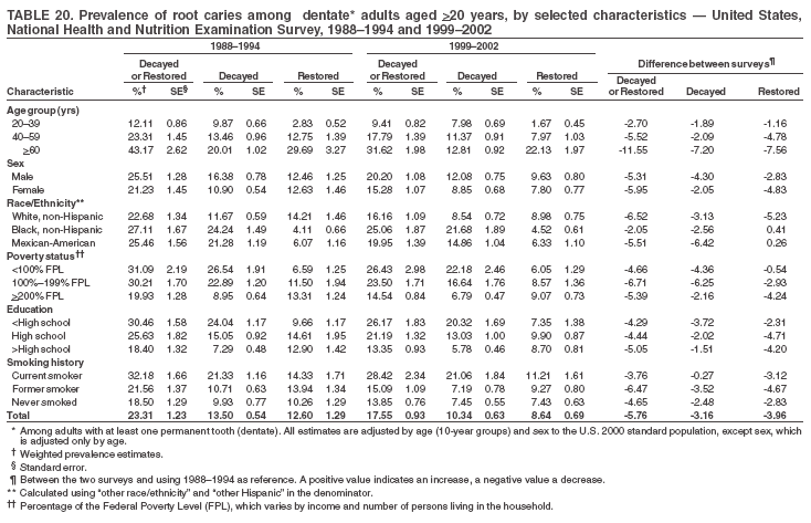 Approximately 18% of dentate adults aged >20 years had root caries (including untreated and restored lesions) (Table 20). Prevalence of root caries increased with age: 9.4% among persons aged 20--39 years, 17.8% among those aged 40--59 years, and 31.6% among those aged >60 years. Ten percent had one or more untreated carious lesions in roots (untreated root caries). Women had a lower prevalence of untreated root caries (8.9%) than men (12.1%). Non-Hispanic white adults had a lower prevalence of untreated root caries (8.5%) than Mexican-American (14.9%) and non-Hispanic black (21.7%) adults. Prevalence of untreated root caries was lower among those with family incomes >200% of the FPL (6.8%) than among those with lower income (16.6% for those with family incomes >100% but <200% of the FPL and 22.8% for those with family incomes <100% of the FPL). Education was inversely correlated with prevalence of untreated root caries: 20.3% among those with less than a high school education, 13.0% among high school graduates, and 5.8% among those with greater than a high school education. Current smokers had a higher prevalence of untreated root caries (21.1%) compared with former and never smokers (both approximately 7%). Overall, the prevalence of untreated root caries decreased among dentate adults aged >20 years, from 13.5% in 1988--1994 to 10.3% in 1999--2002. Decreases were greater among those aged >60 years (from 20% to 12.8%), Mexican-Americans (from 21.3% to 14.9%), and those with family incomes between 100% and 200% of the FPL (from 22.9% to 16.6%) (Table 20, Figure 15).