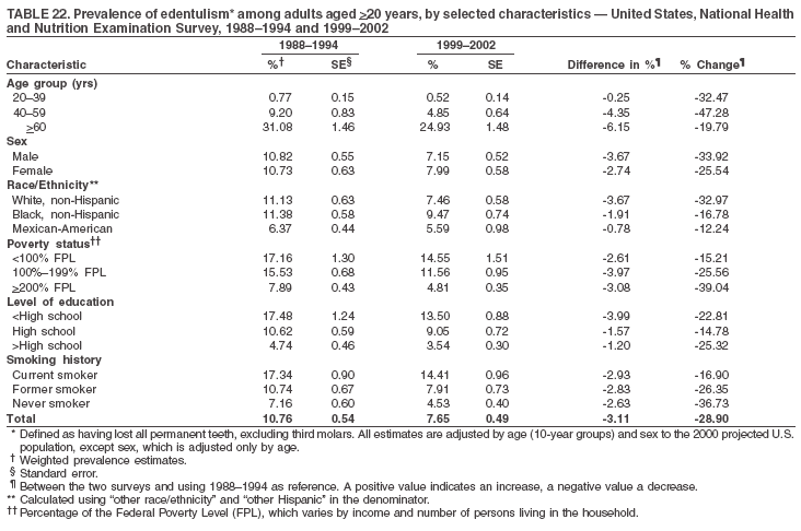Approximately 8% of adults aged >20 years had lost all their natural teeth (edentulism) (Table 22). Prevalence of edentulism increased with age: <1% among adults aged 20--39 years, 4.9% among those aged 40--59 years, and 24.9% among those aged >60 years. Mexican-American adults had a lower prevalence of edentulism (5.6%) than non-Hispanic blacks (9.5%). Adults with family income >200% of the FPL had a lower prevalence of edentulism (4.8%) than adults with lower family incomes (11.6% and 14.6%). An inverse correlation was observed between edentulism and education: 13.5% of adults with less than a high school education, 9.1% of adults who graduated from high school, and 3.5% of adults with more than a high school education were edentulous. A correlation also was observed between edentulism and smoking: 14.4% among current smokers, 7.9% among former smokers, and 4.5% among those who never smoked. Overall, edentulism decreased from 10.8% in 1988--1994 to 7.7% in 1999--2002. The largest decreases were observed among adults with family incomes between 100% and 200% of the FPL, for those with less than a high school education, and among adults aged >40 years (Table 22, Figure 17).