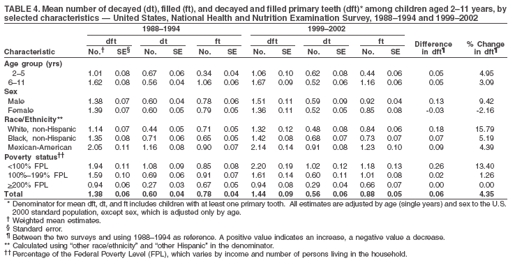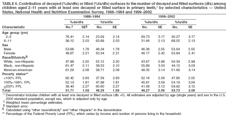 The mean dft among children aged 2--11 years was 1.4 (Table 4). The mean dfs was 3.2 (Table 5). Mexican-American children had a mean dfs of 4.6, approximately one-and-a-half surfaces more than non-Hispanic white or black children. Children from families with incomes >200% of the FPL had a lower mean dfs (1.96) than did children from families with lower income (3.8 and 5.2). Overall, no change in mean dfs was observed from 1998--1994 to 1999--2002 (Table 5, Figure 3).